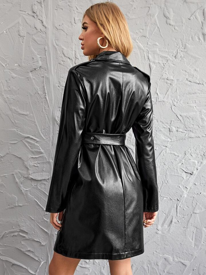 Single Breasted Belted PU Leather Coat