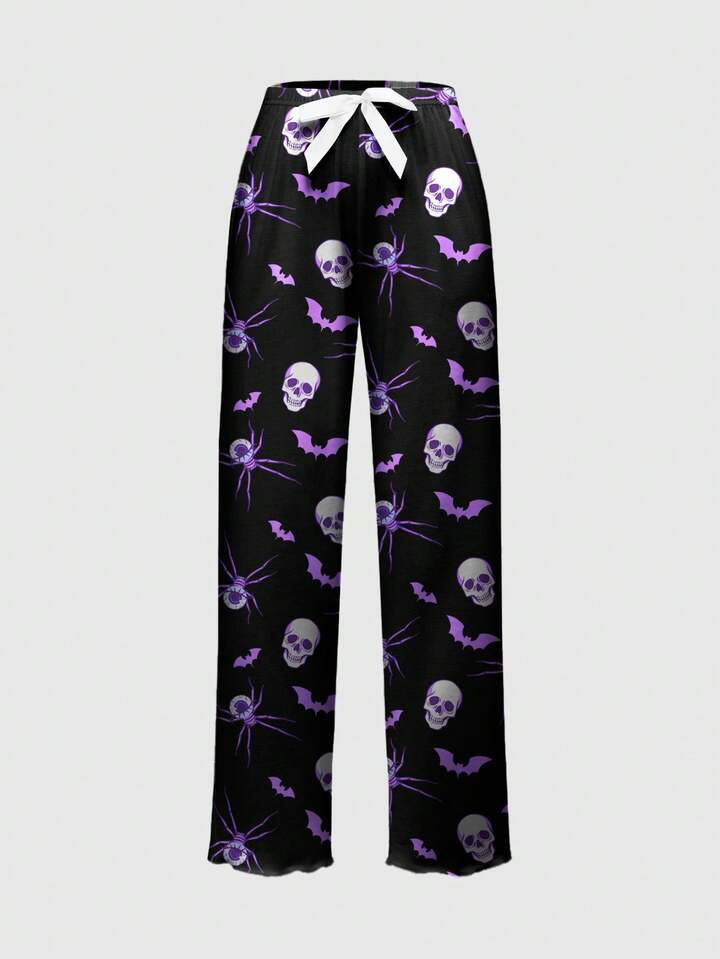 Skeleton, Bat, Spider All-Over Print Gothic Style Camisole & Pants Pajama Set, Casual Sleepwear