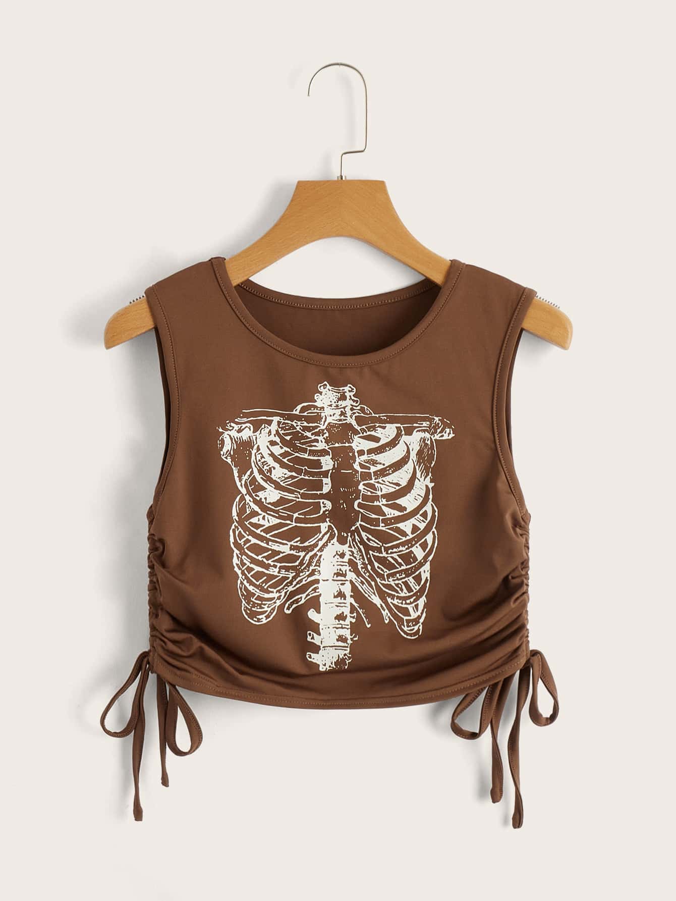 Skeleton Graphic Drawstring Ruched Crop Tank Top