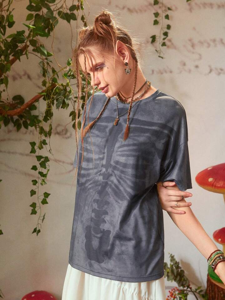 Skeleton Print Tie Dye Drop Shoulder Tee