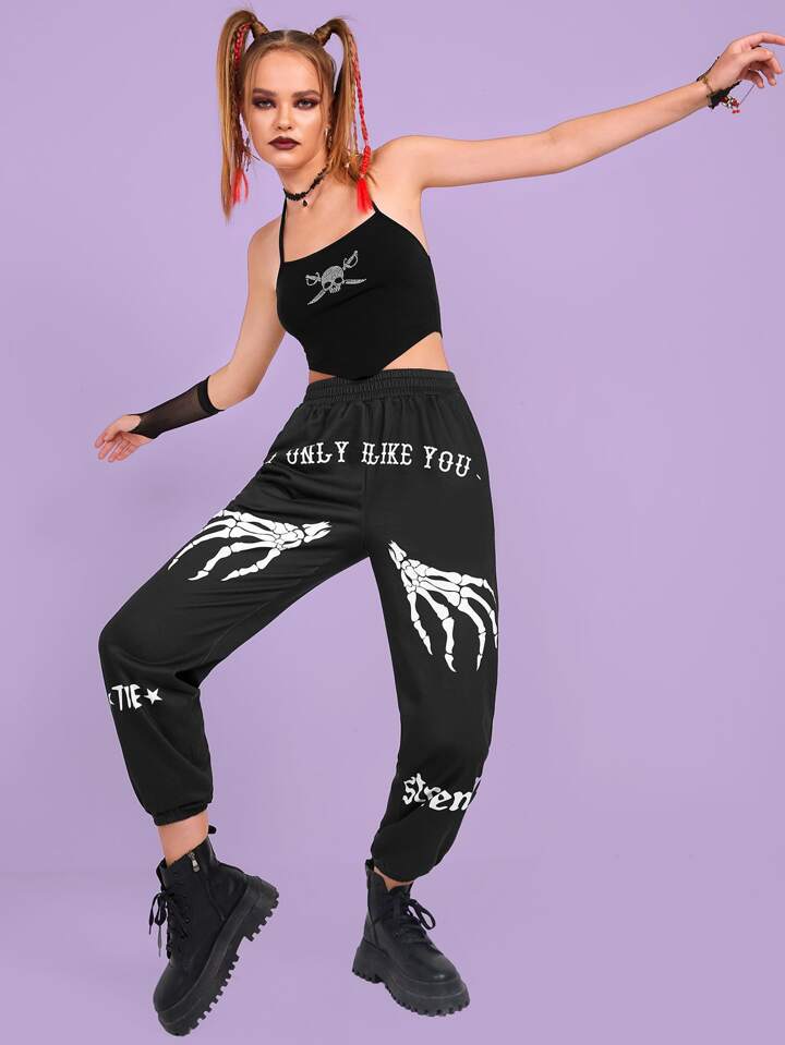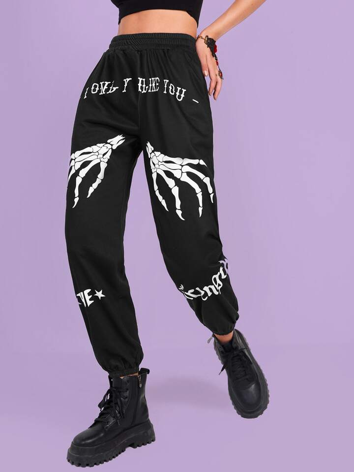 Slogan & Finger Skeleton Print Shirred Waist Sweatpants