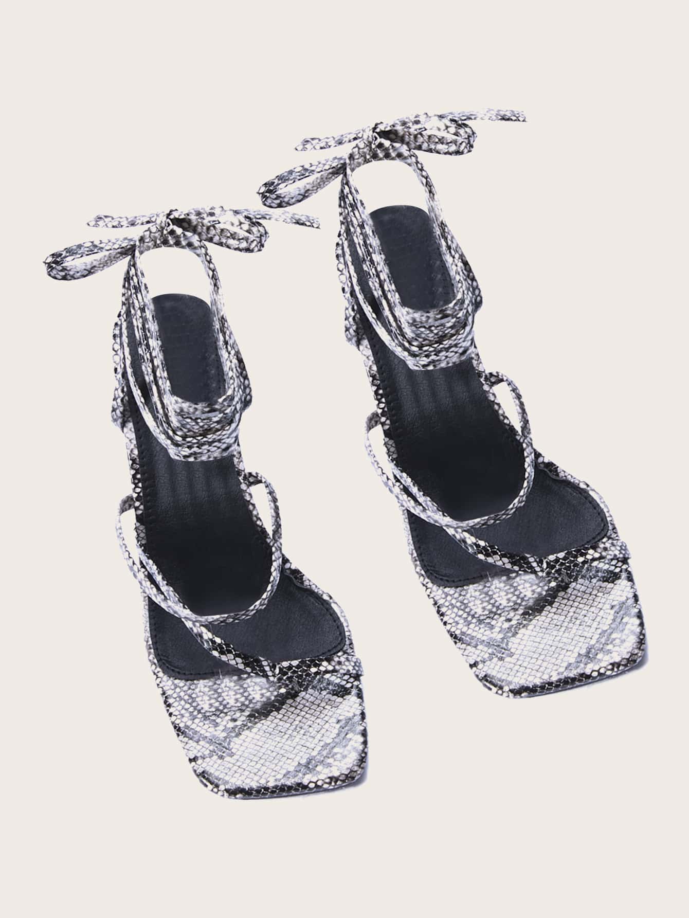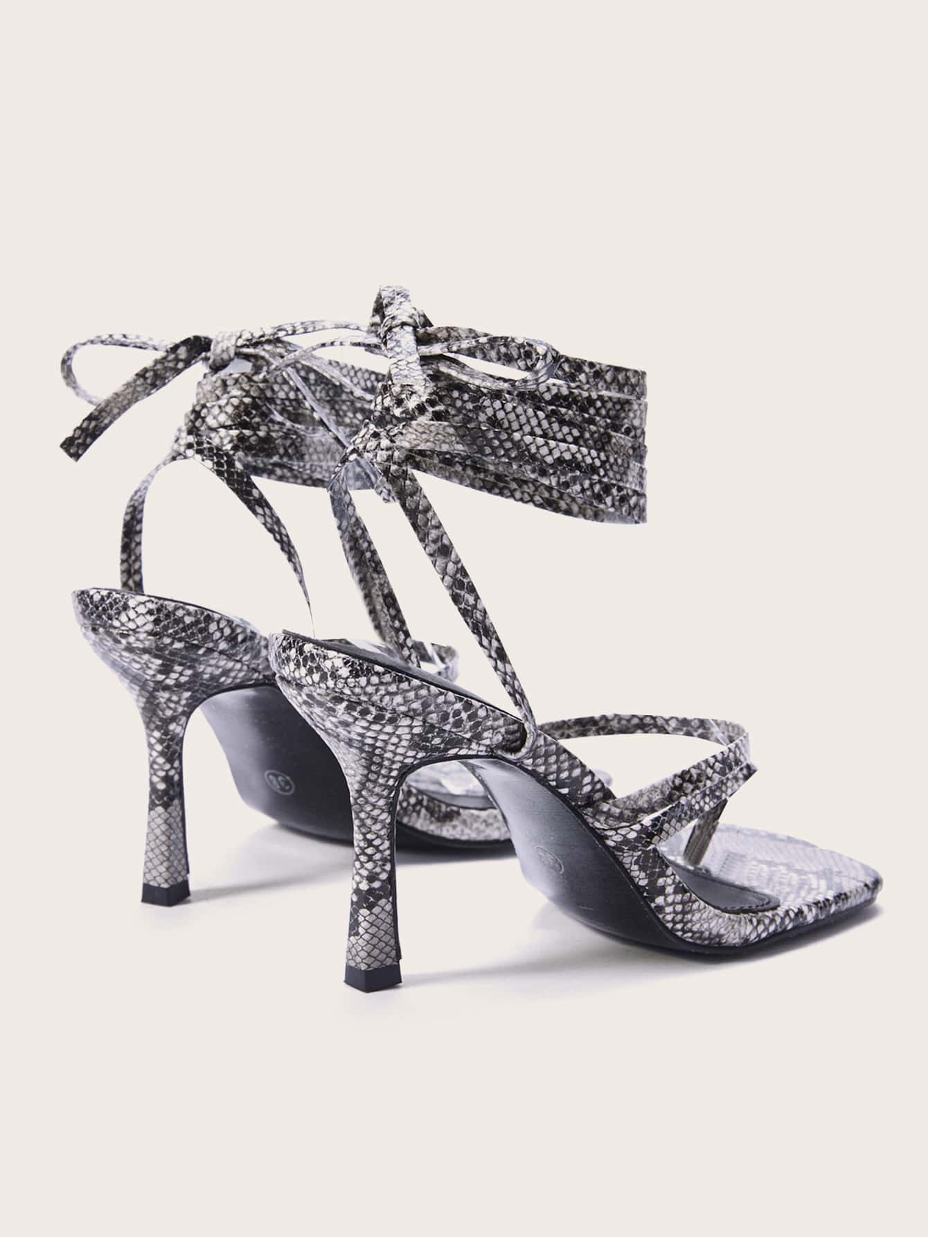 Snakeskin Print Toe Loop Tie Leg Heeled Sandals