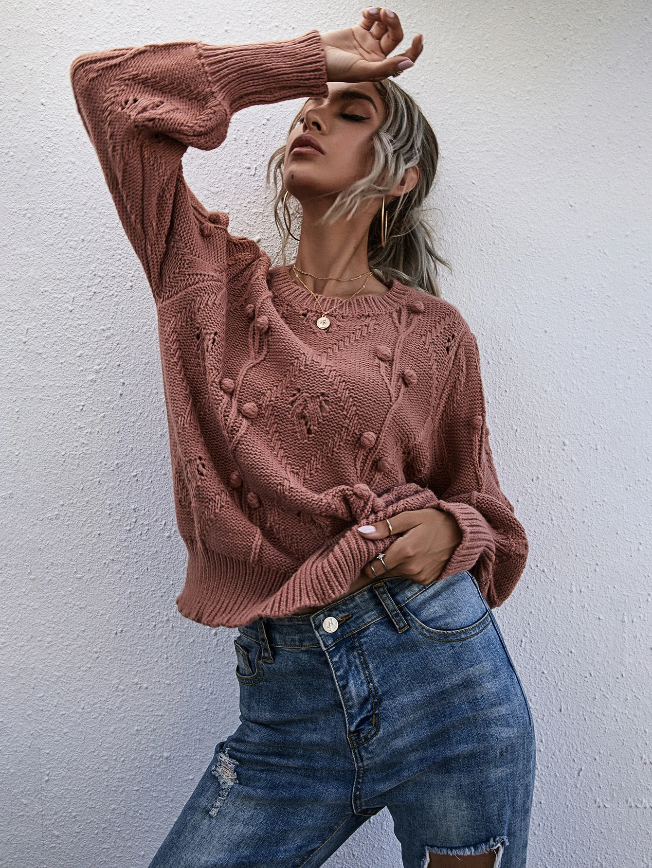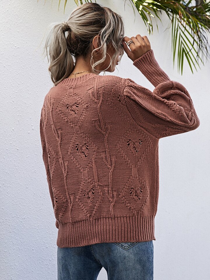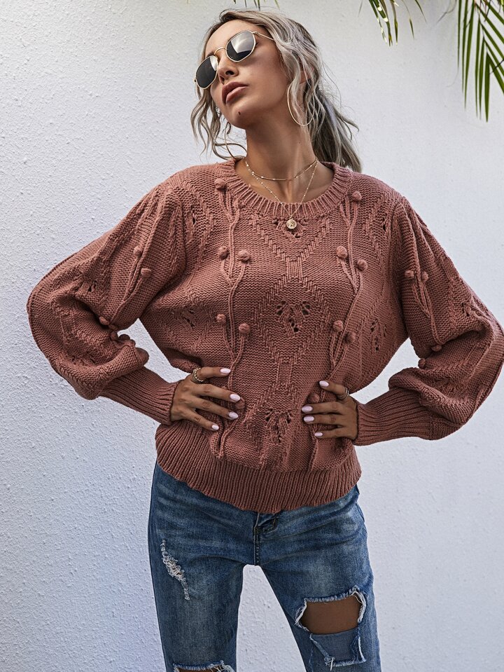 Solid Bishop Sleeve Popcorn Knit Sweater