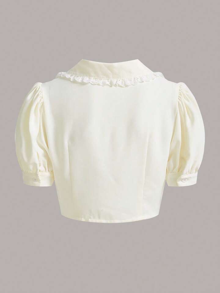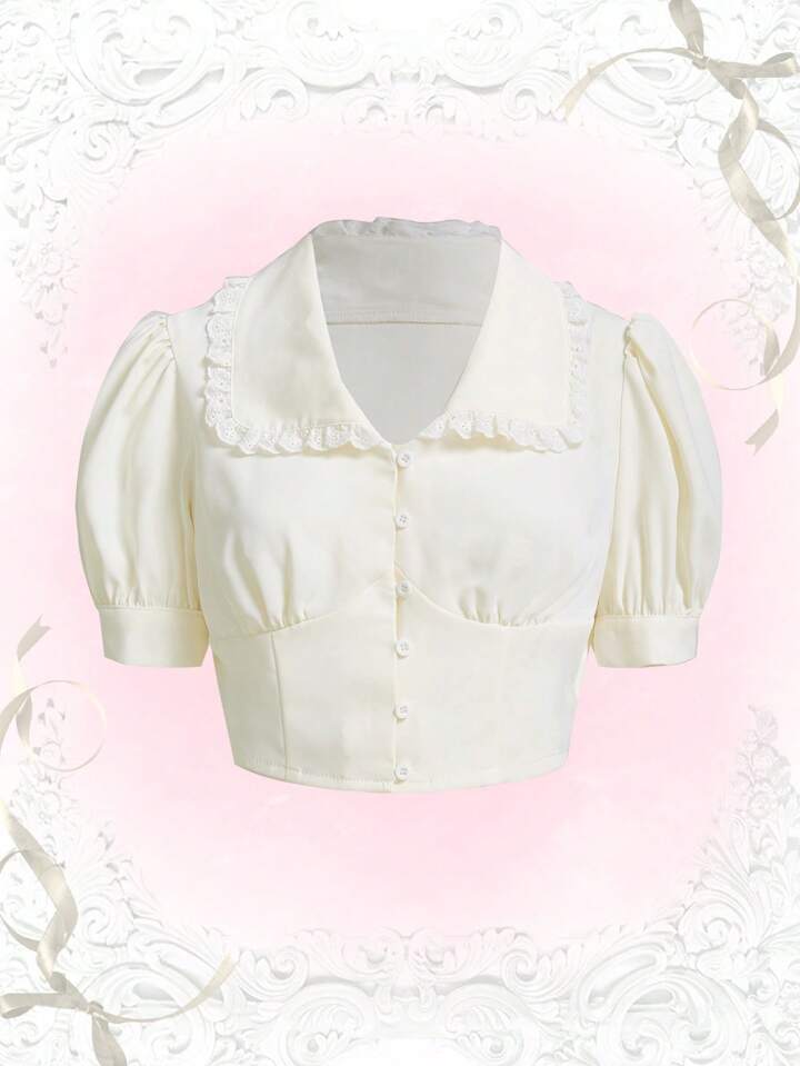 Solid Button Front Puff Sleeve Crop Shirt