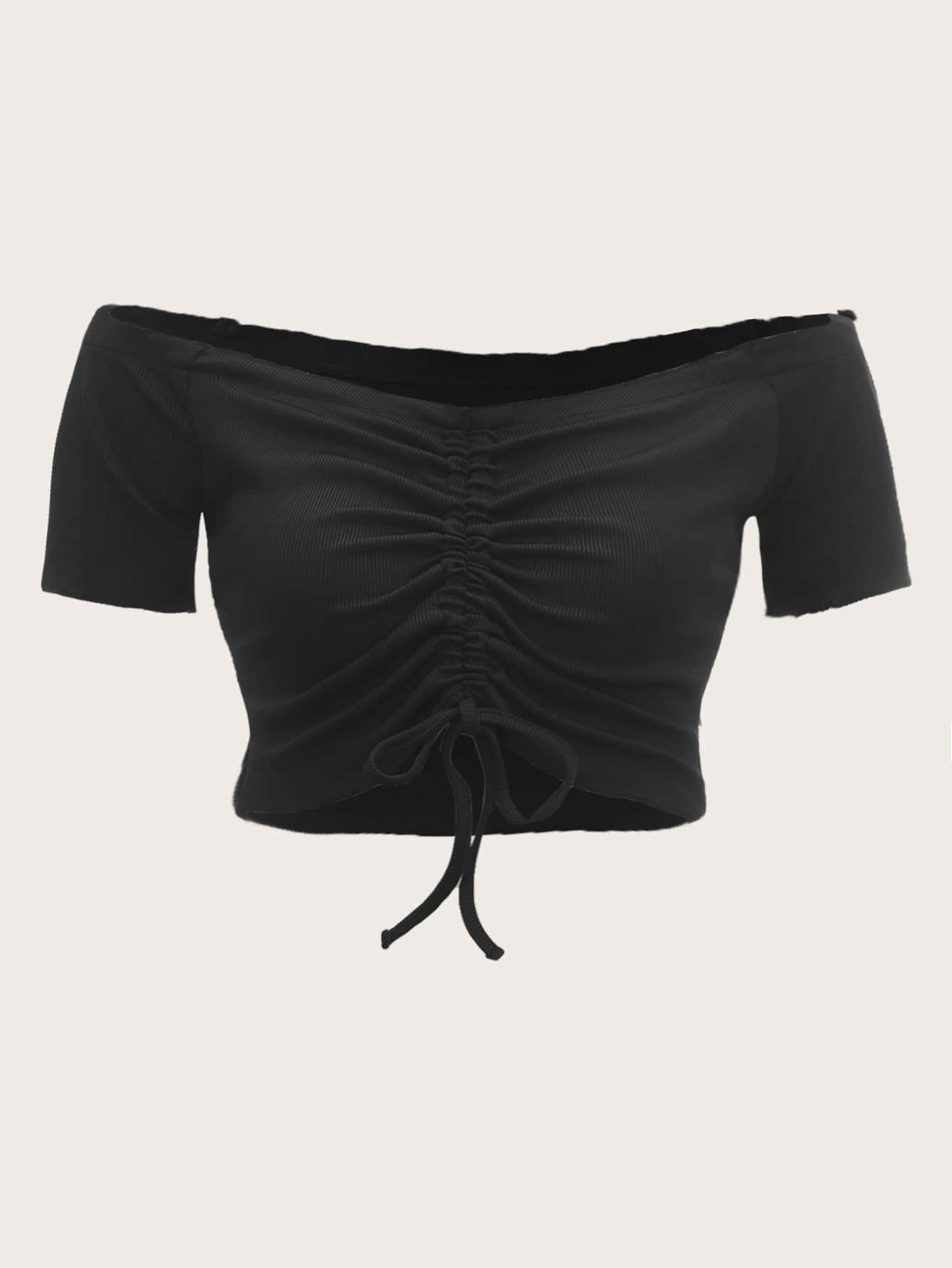 Solid Off The Shoulder Drawstring Ruched Crop Tee