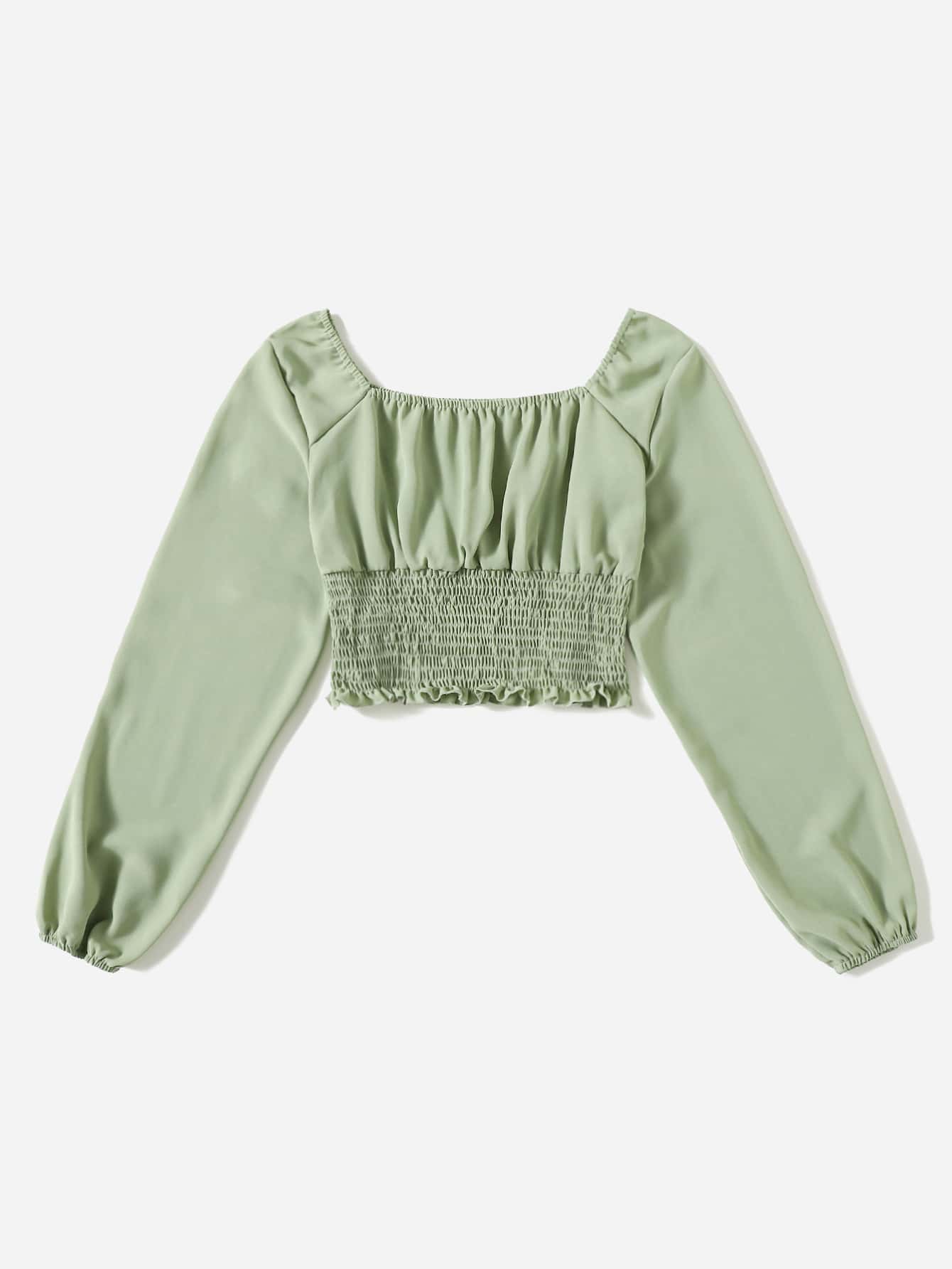 Solid Ruched Bust Scoop Neck Shirred Blouse