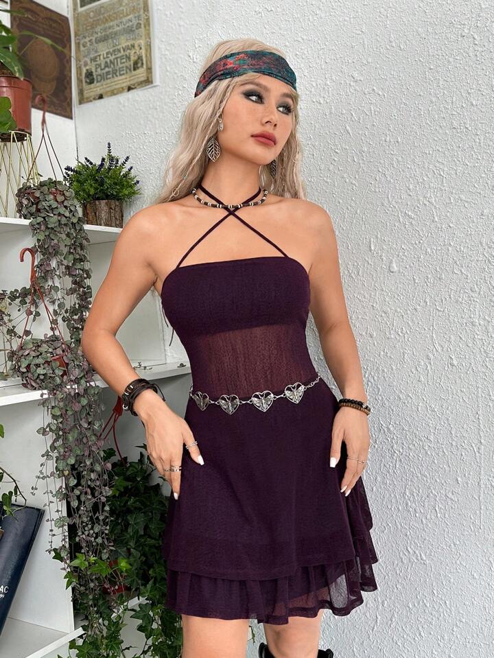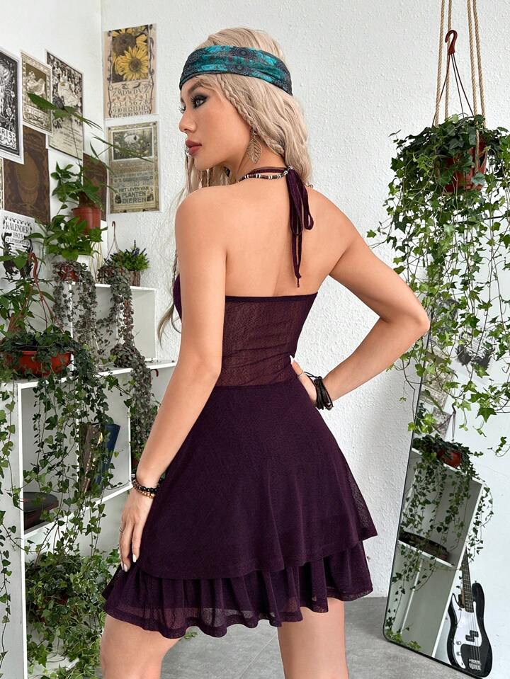 Solid Ruffle Hem Mesh Overlay Halter Dress Without Belt