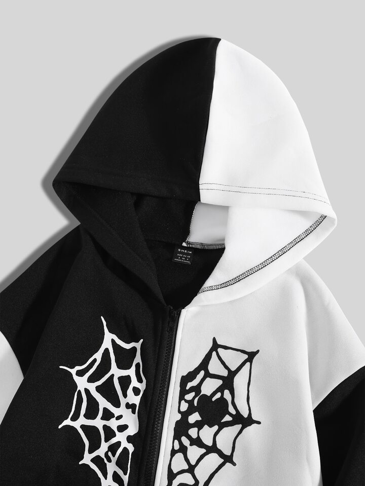 Spider Web & Heart Print Zipper Thermal Hoodie