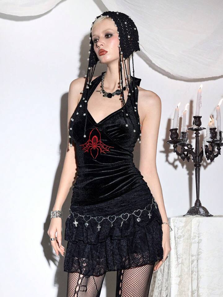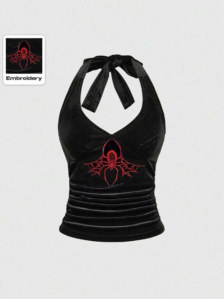 Spider Web Print Women's Gothic Pleated Halter Neck Tank Top