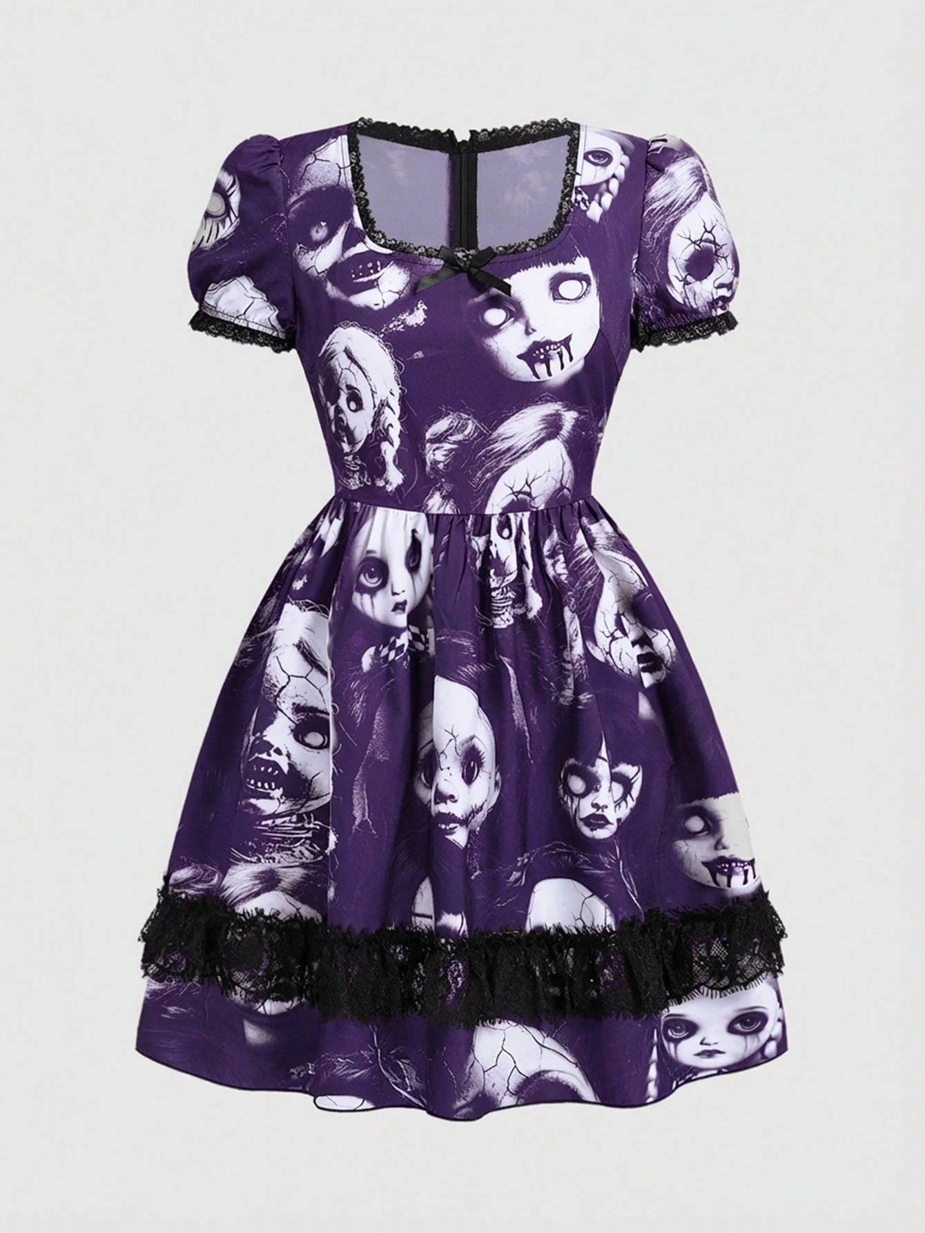 Spring/SummergraphicGothic Dark Witch Lace Patchwork Doll Print Short Dress For Women