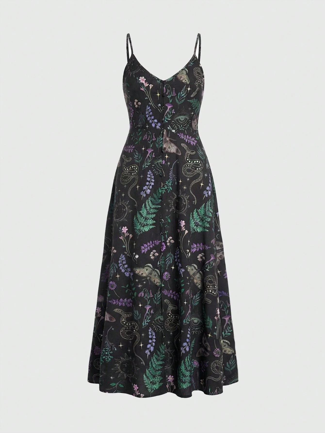 Spring/SummervacationgraphicGothic Dark Moth Leaf Plant Butterfly Snake Sun Moon Star Mori Style Spaghetti Strap Low-Cut Sexy Long Dress For Women, Spring/Summer