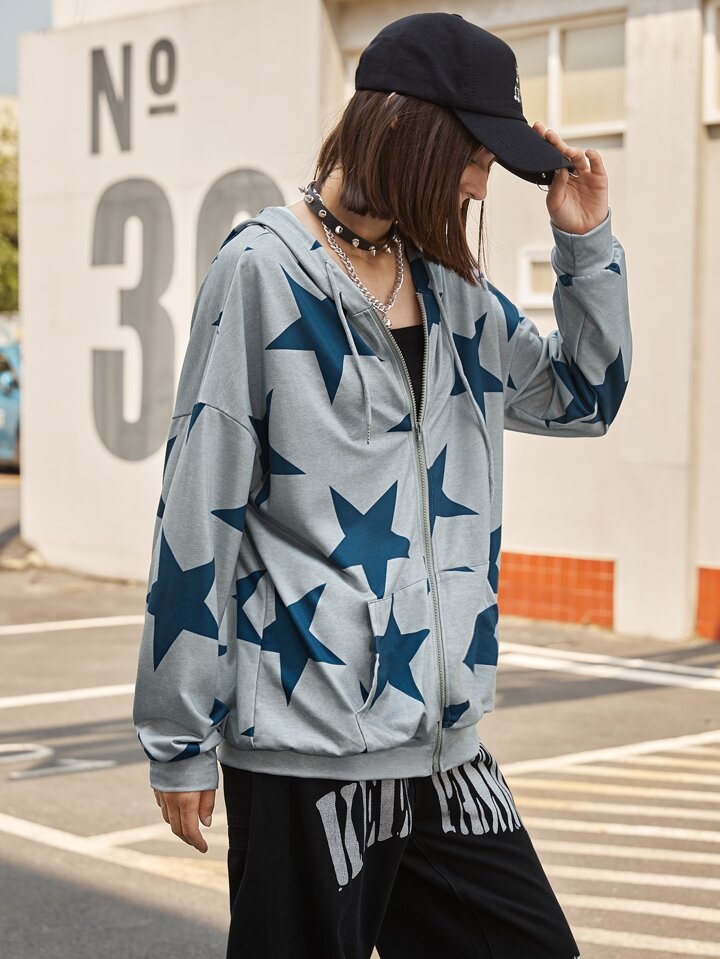 Star Print Drop Shoulder Zip Up Drawstring Hoodie