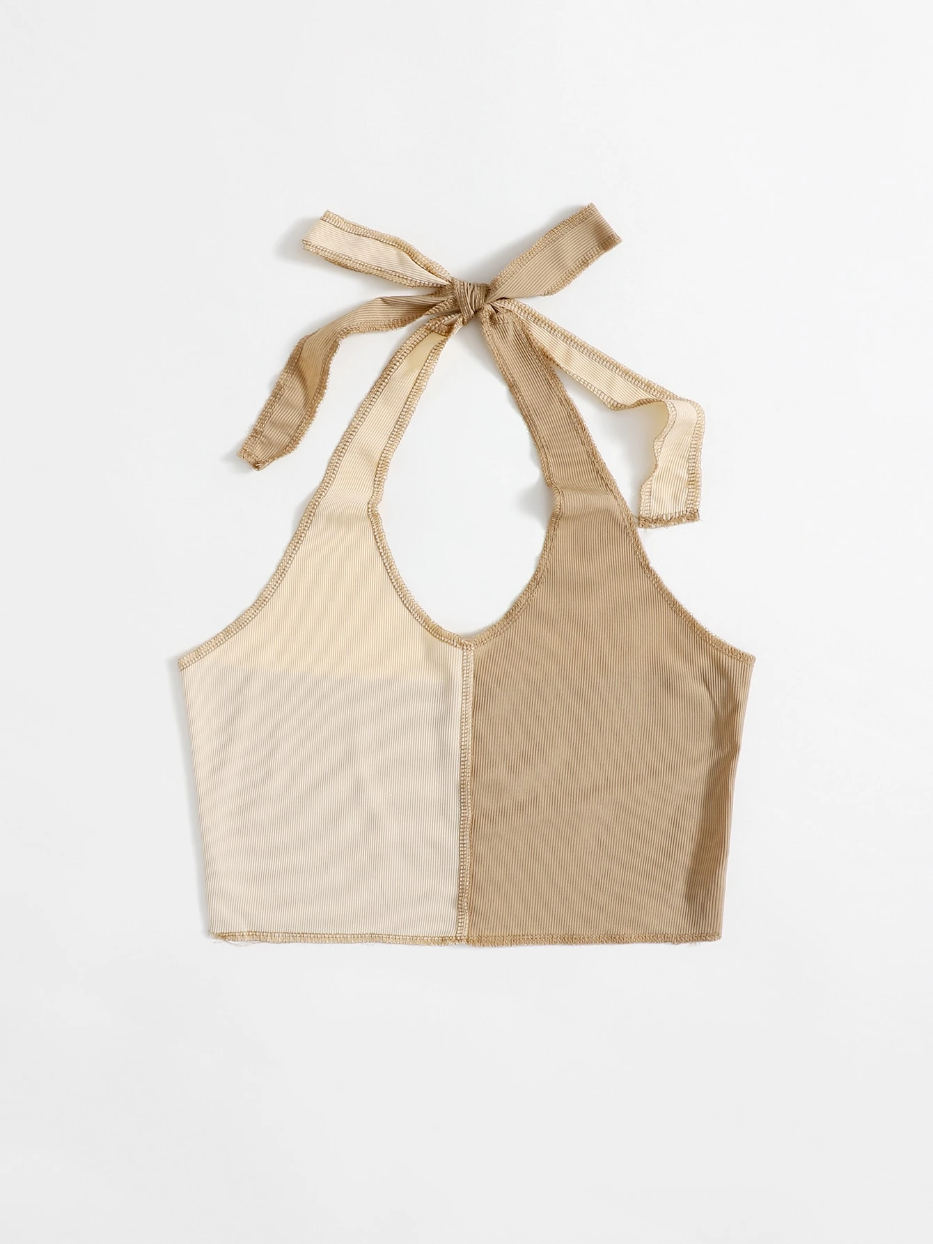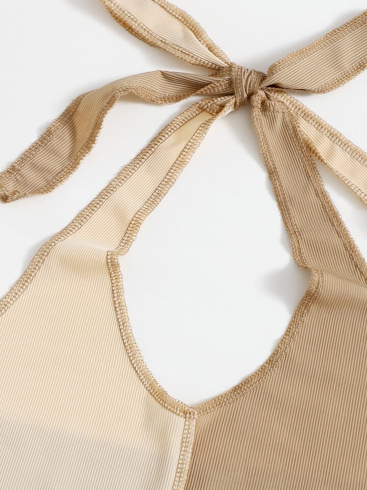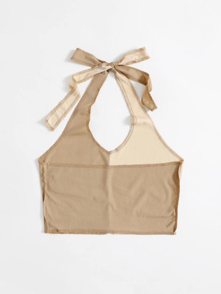 Stitching Trim Colorblock Ribbed Halter Top