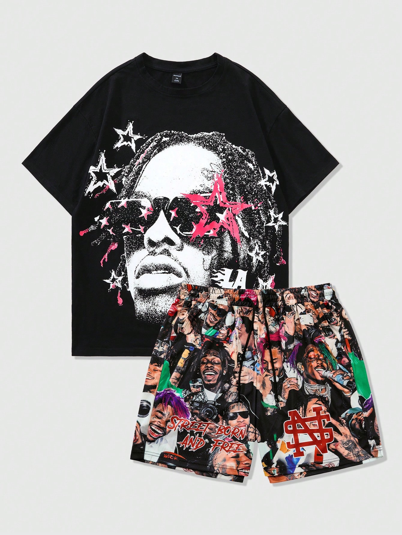 Street Life 2pcs Men Street Portrait Print Short Sleeve T-Shirt & Shorts Casual Summer Suit