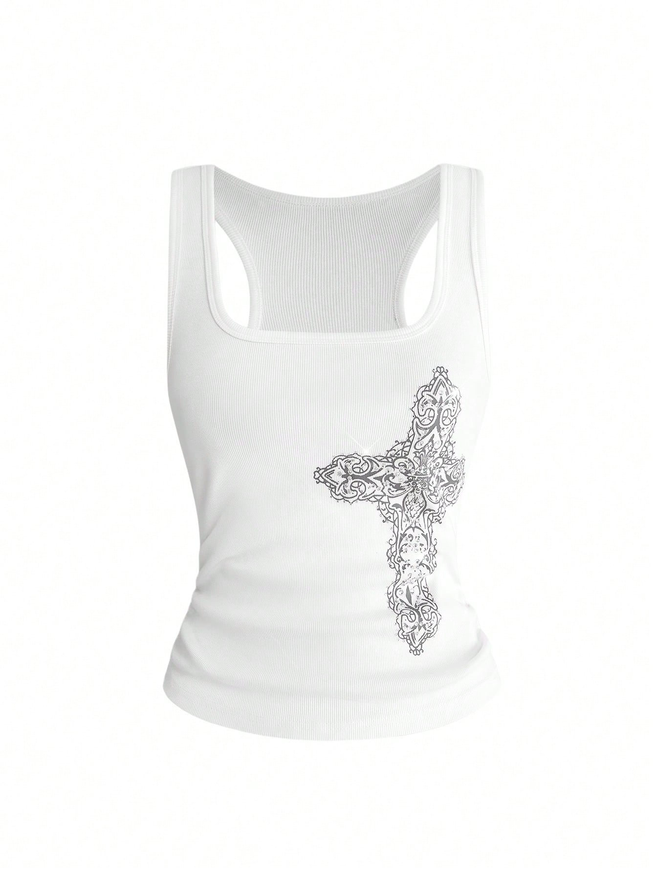 Street Life Grunge Cross Print Rhinestone Washed Tight Camisole