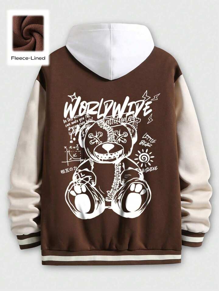 Street Life Guys Bear & Letter Graphic Two Tone Varsity Jacket Without Hoodie