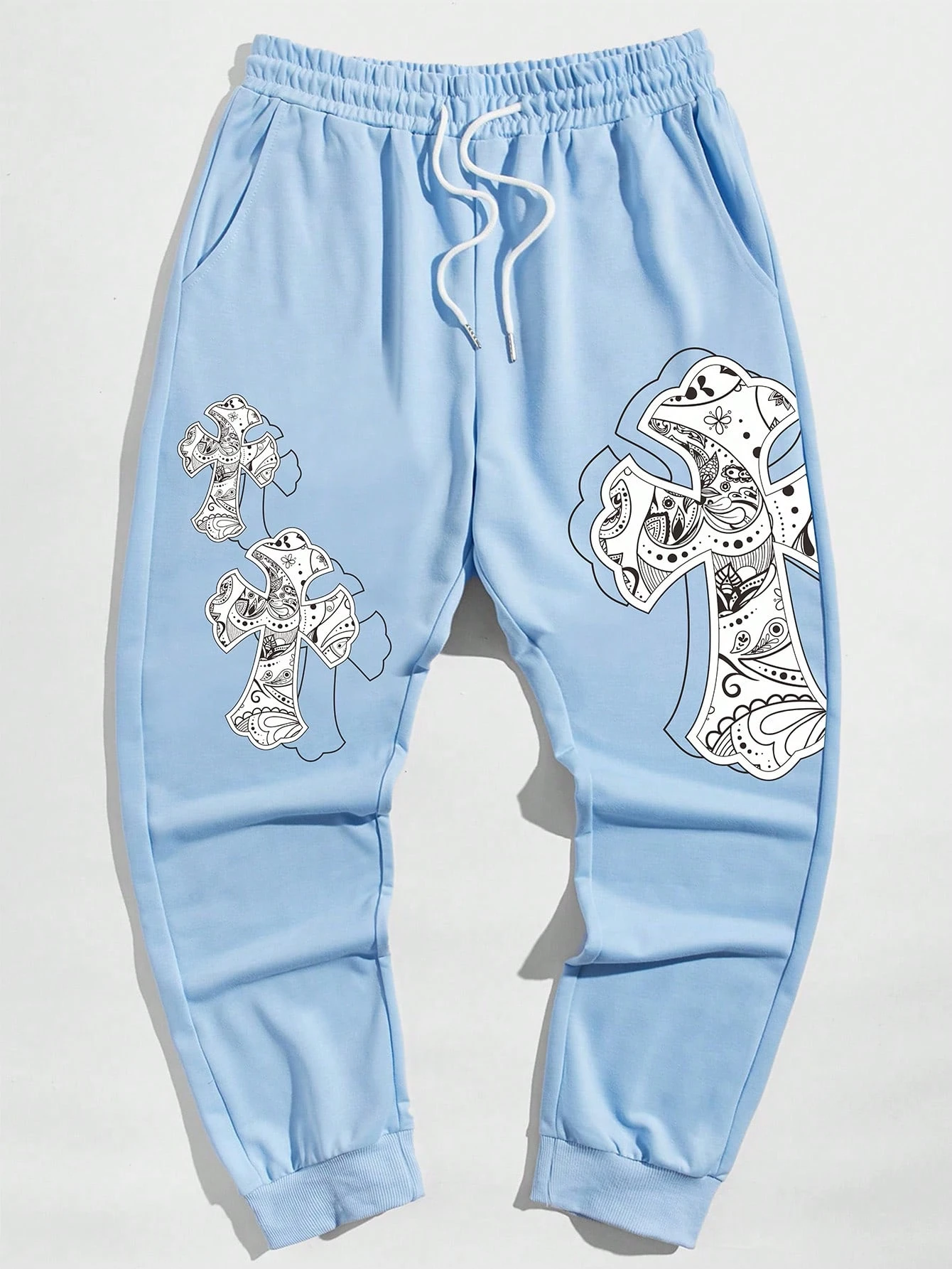 Street Life Men Cross Print Drawstring Waist Sweatpants