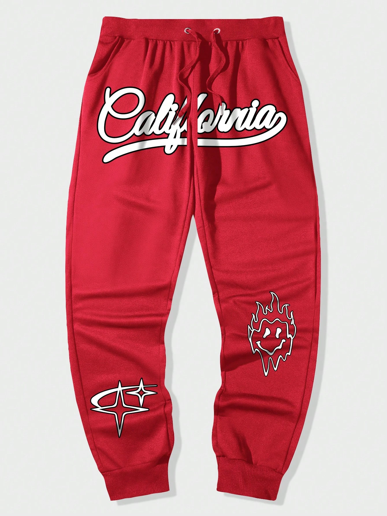 Street Life Men Letter Cartoon Face Graphic Drawstring Waist Sweatpants