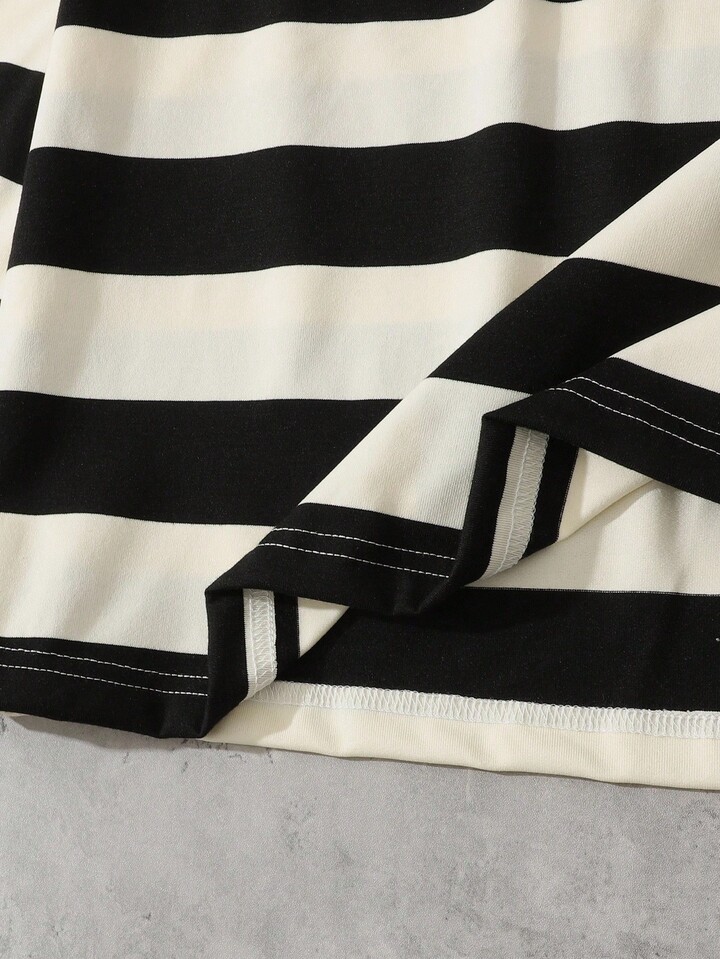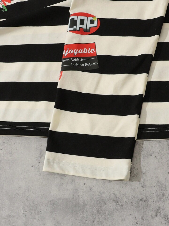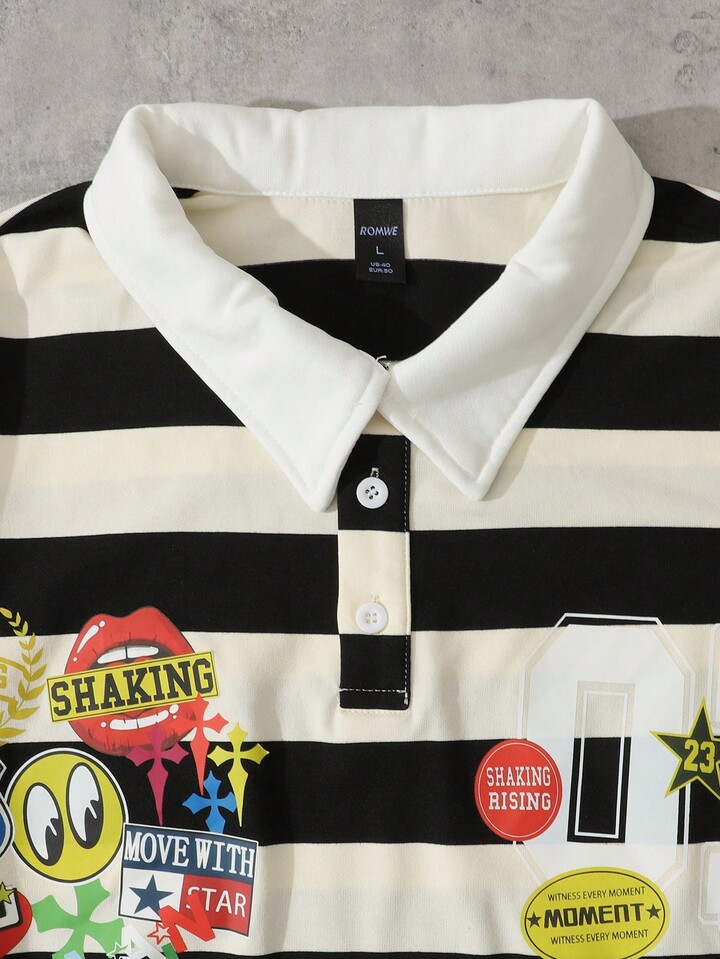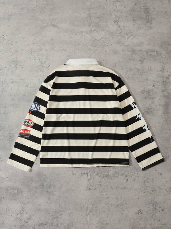 Street Life Men Letter Prep Striped Long Sleeve Casual Loose Polo Collar Sweatshirt, Fall