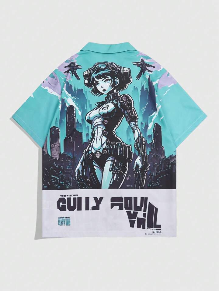 Street Life Men Movie & Cartoon Character Printed Short Sleeve Button Up Shirt, Vacation Style, Suitable For Spring And Summer
