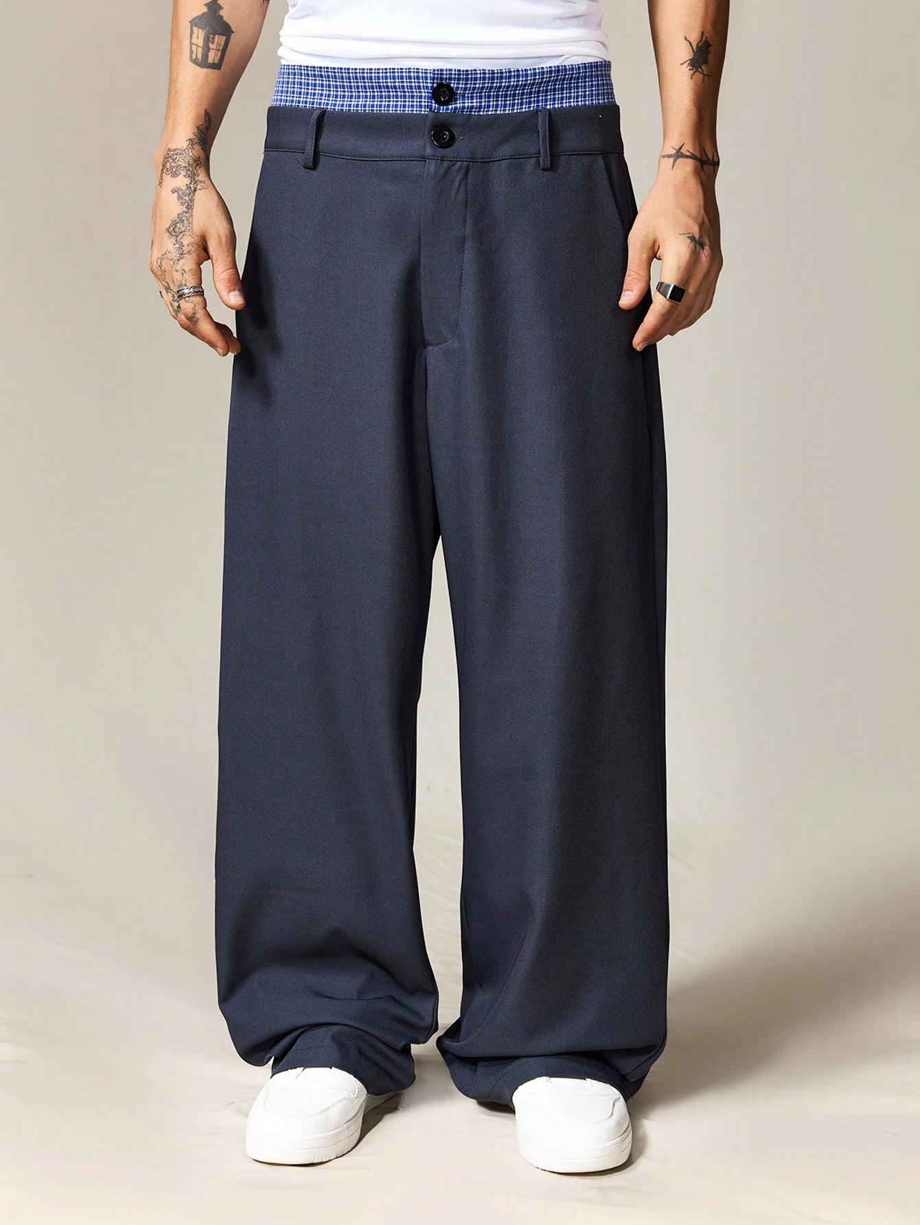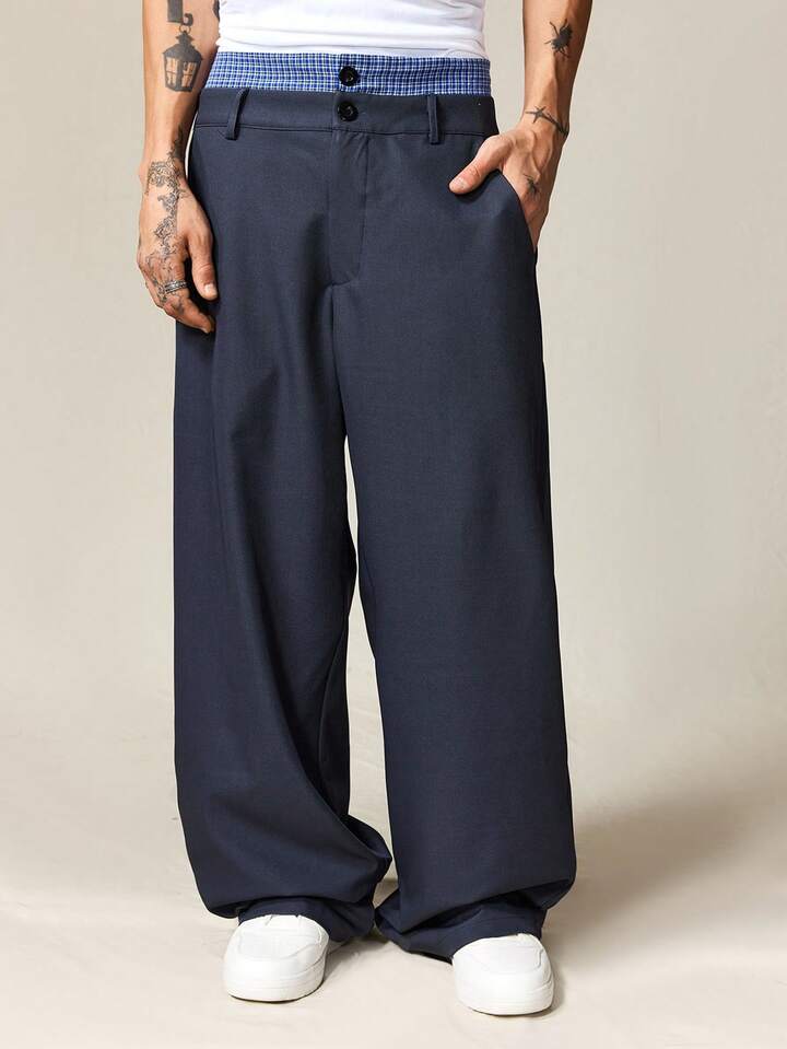 Street Life Men Prep Waist Patchwork Plaid Pocket Wide Leg Loose Casual Pants, Fall