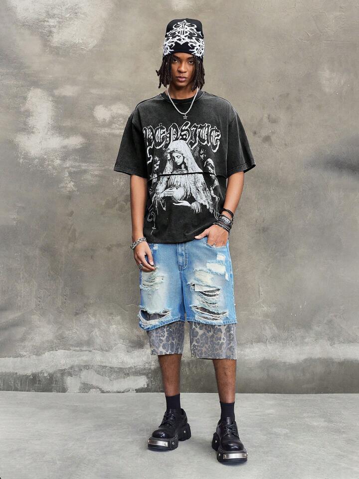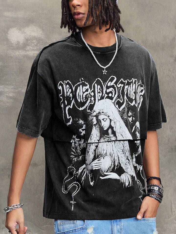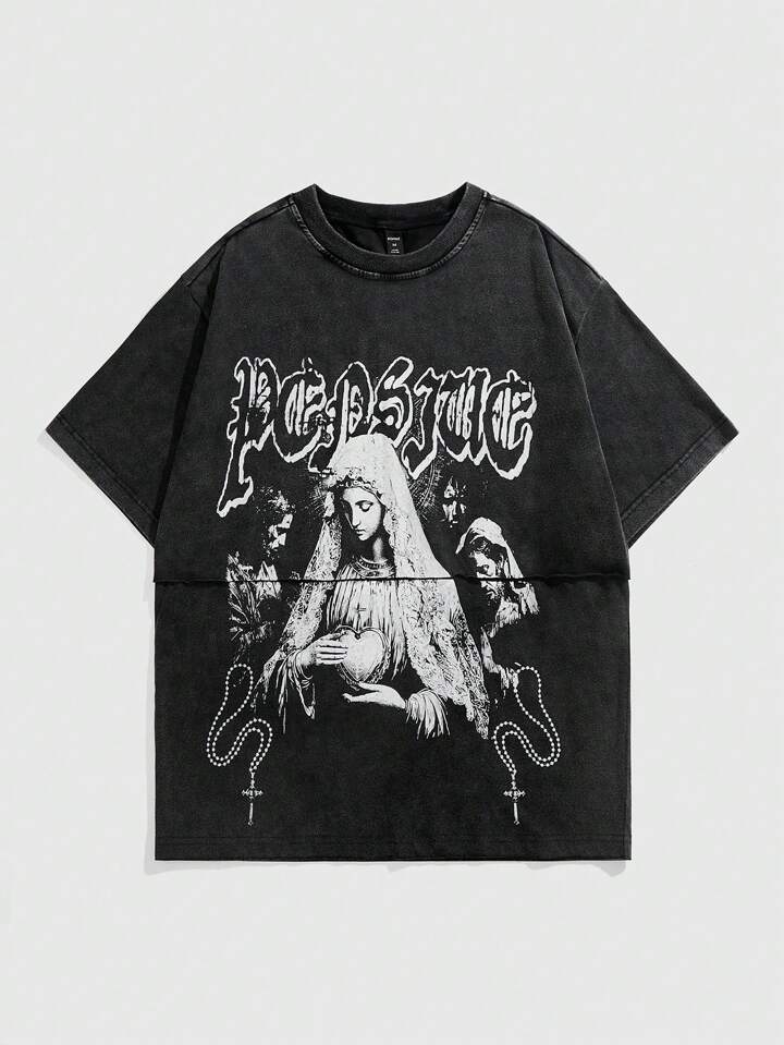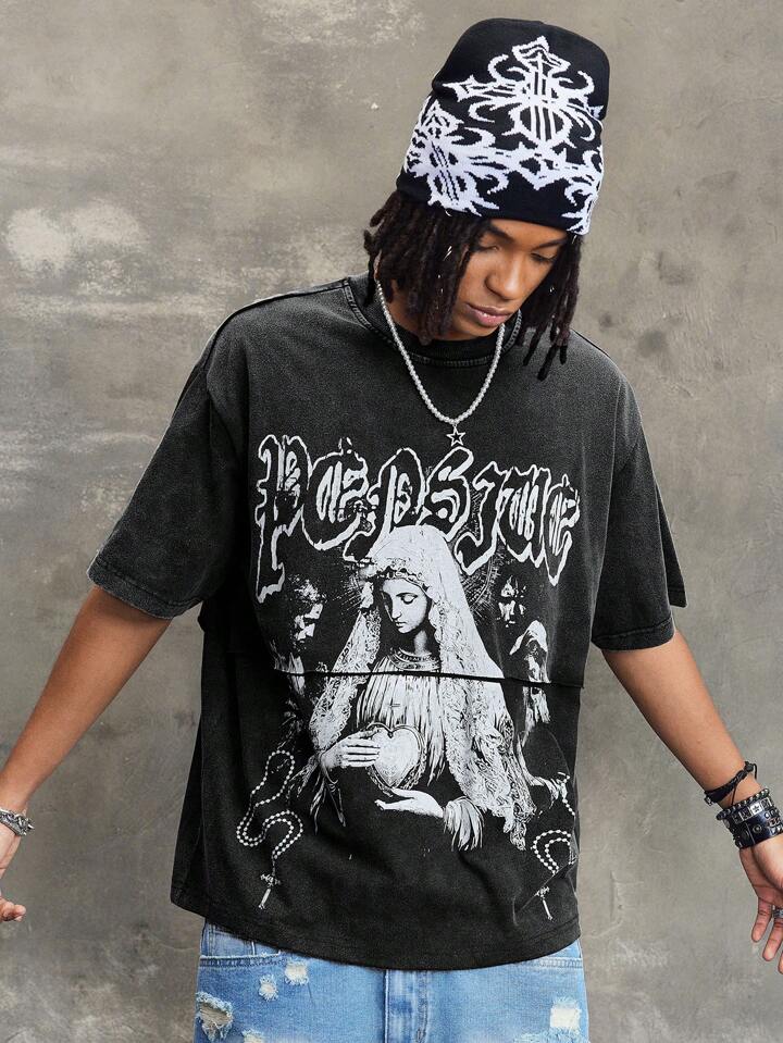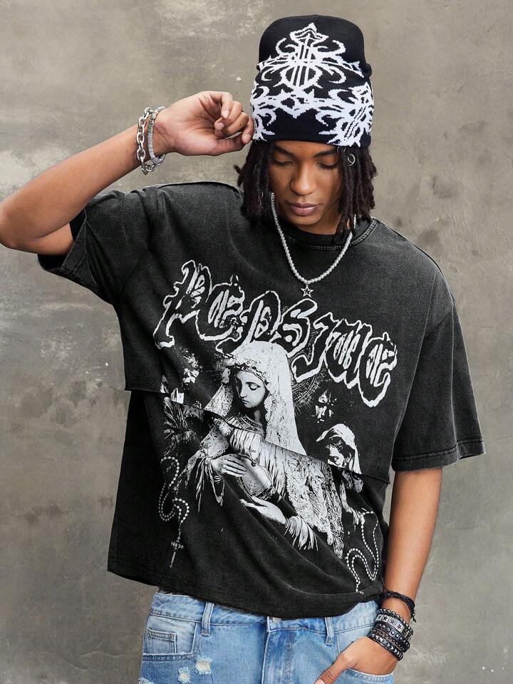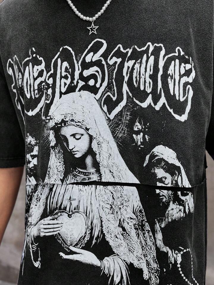Street Life Men Religious Summer Casual Graphic Letter Print Washed T-Shirt