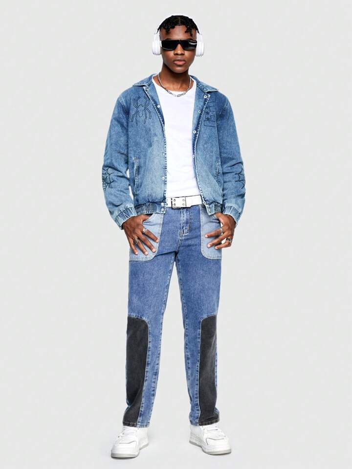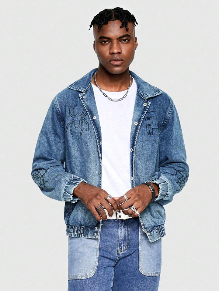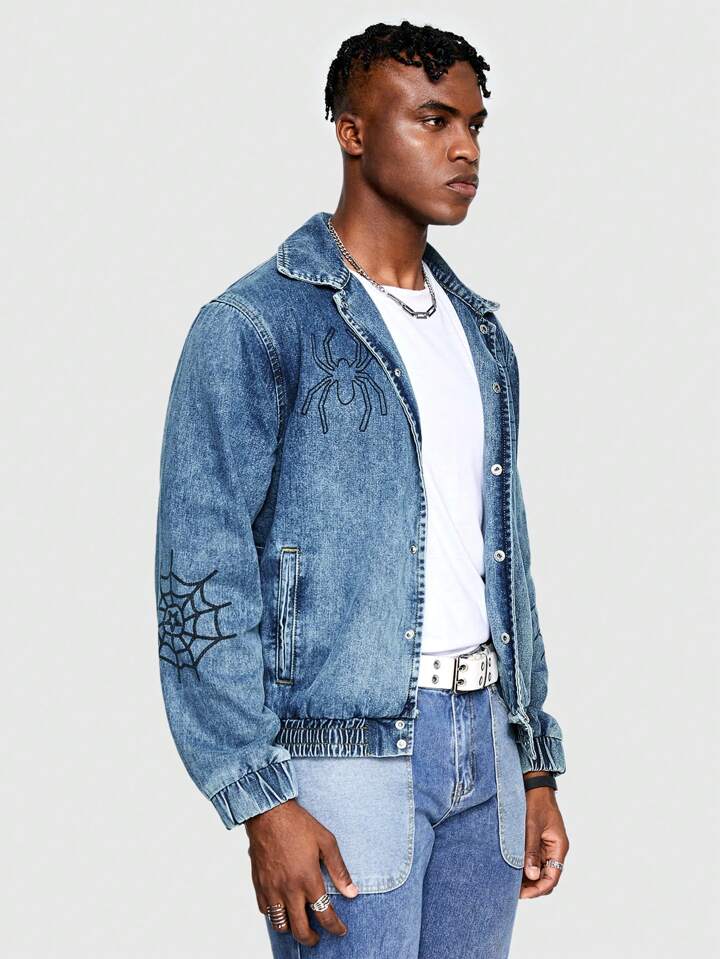 Street Life Men'S Spider Web & Letter Printed Denim Jacket, Halloween