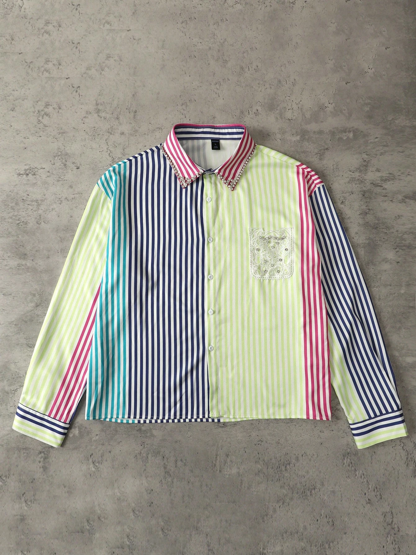 Street Life Men Sparkling Diamond Patchwork Contrast Color Long Sleeve Shirt, Fall