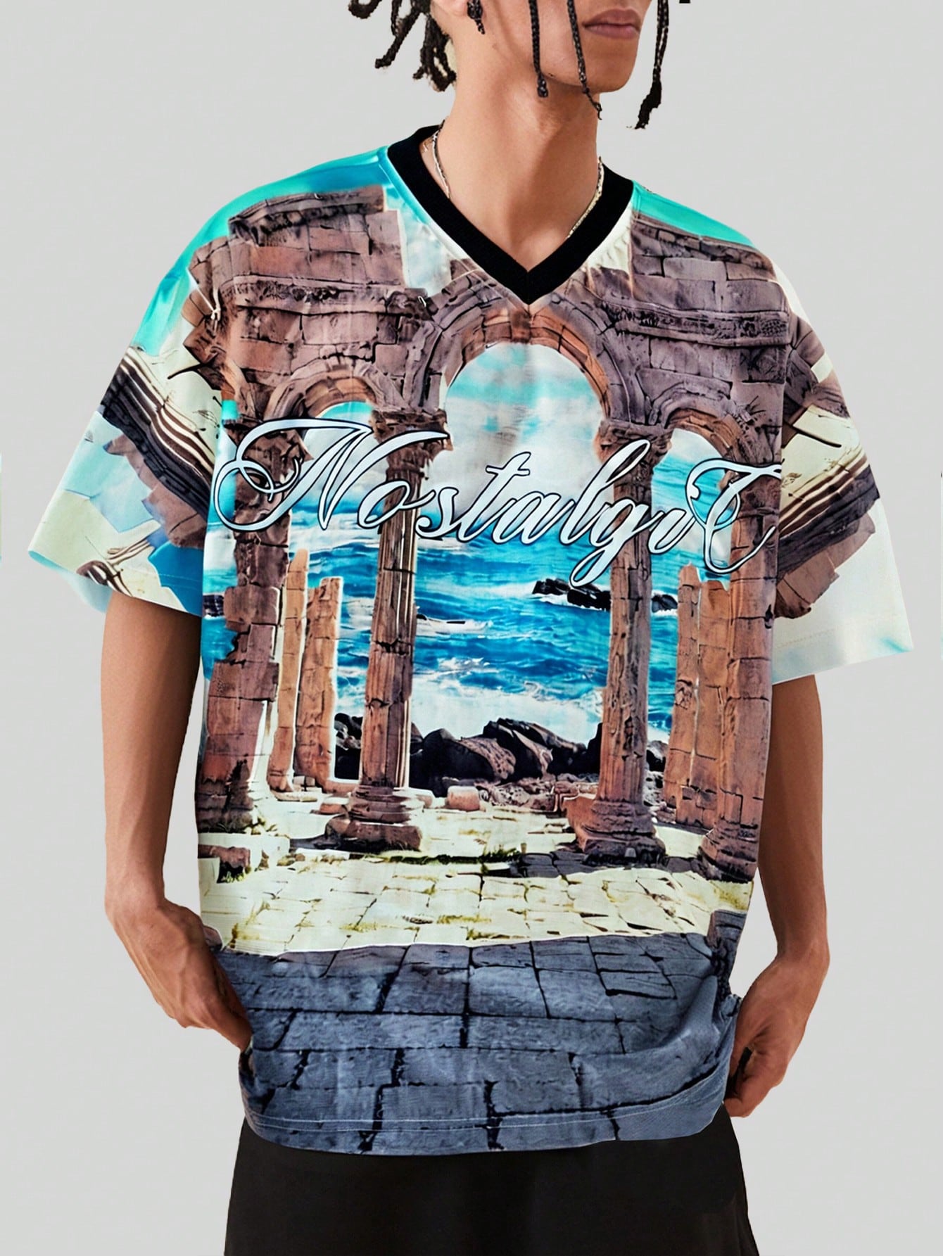 Street Life Men Vintage Temple Run Print Casual V-Neck T-Shirt