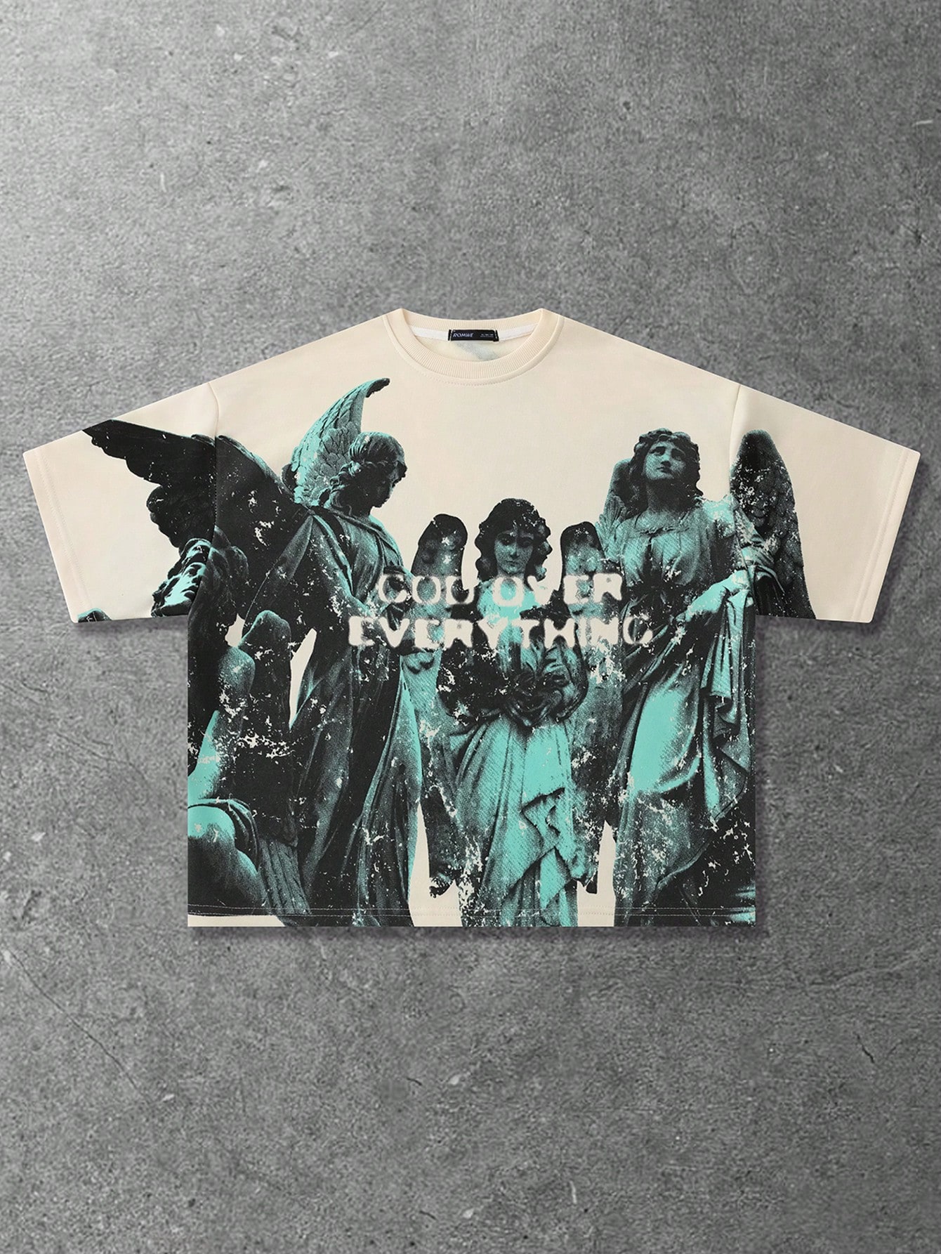 Street Life Men's Angel Letter Print Round Neck Casual Short Sleeve T-Shirt, Loose Fit