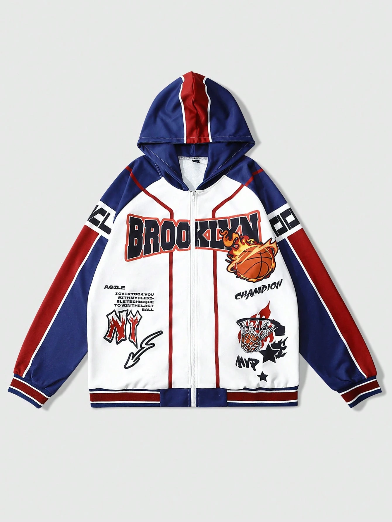 Street Life Men's Autumn Slogan & Basketball Print Zip-Up Hoodie, Suitable For Casual Wear And Basketball