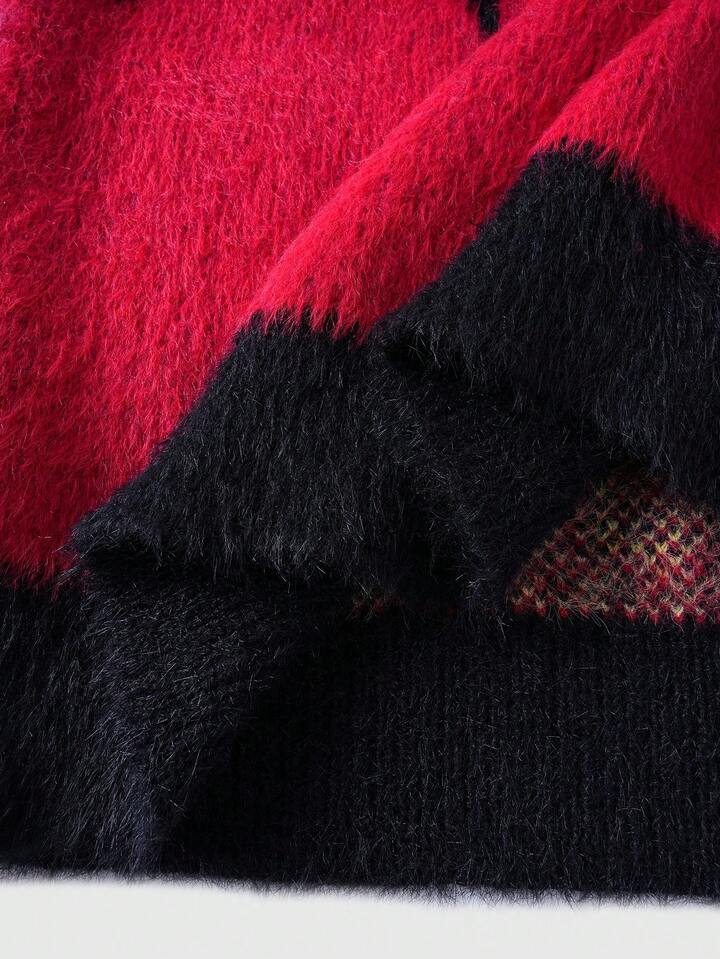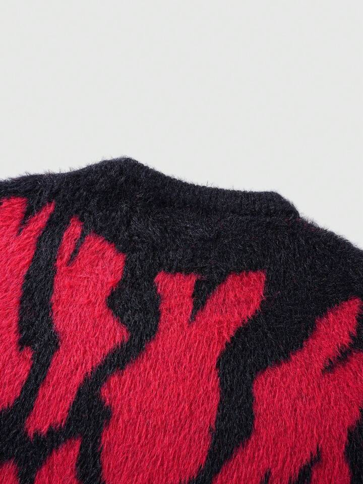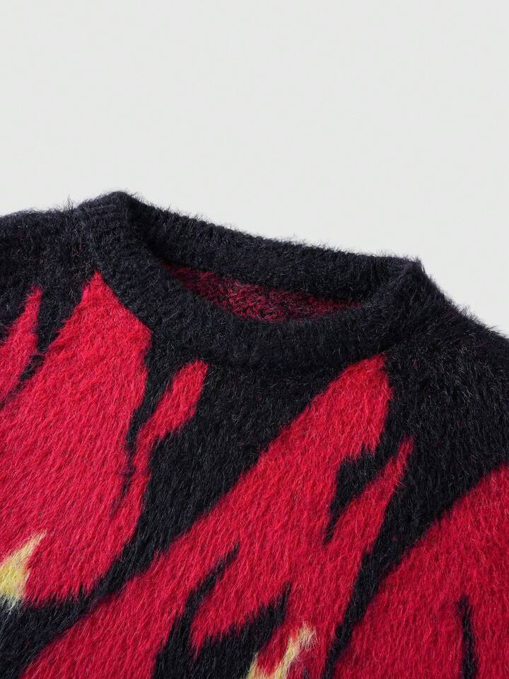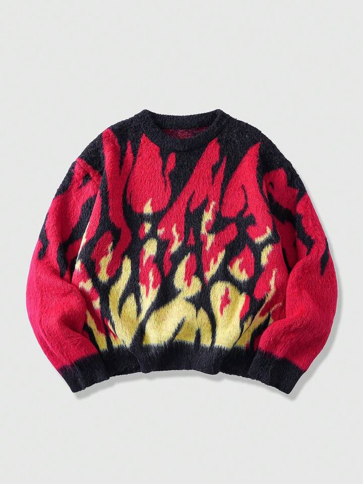 Street Life Men's Autumn/Winter Fashionable Colorblock Flame Pattern Sweater, Long Sleeve Top