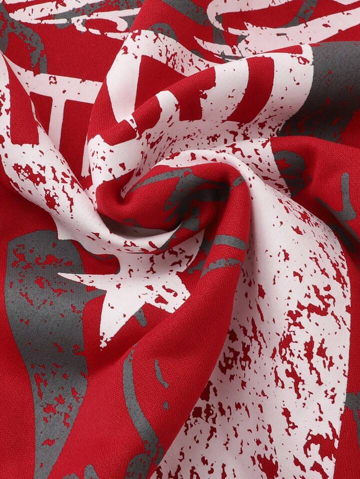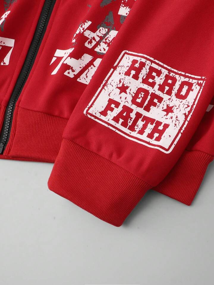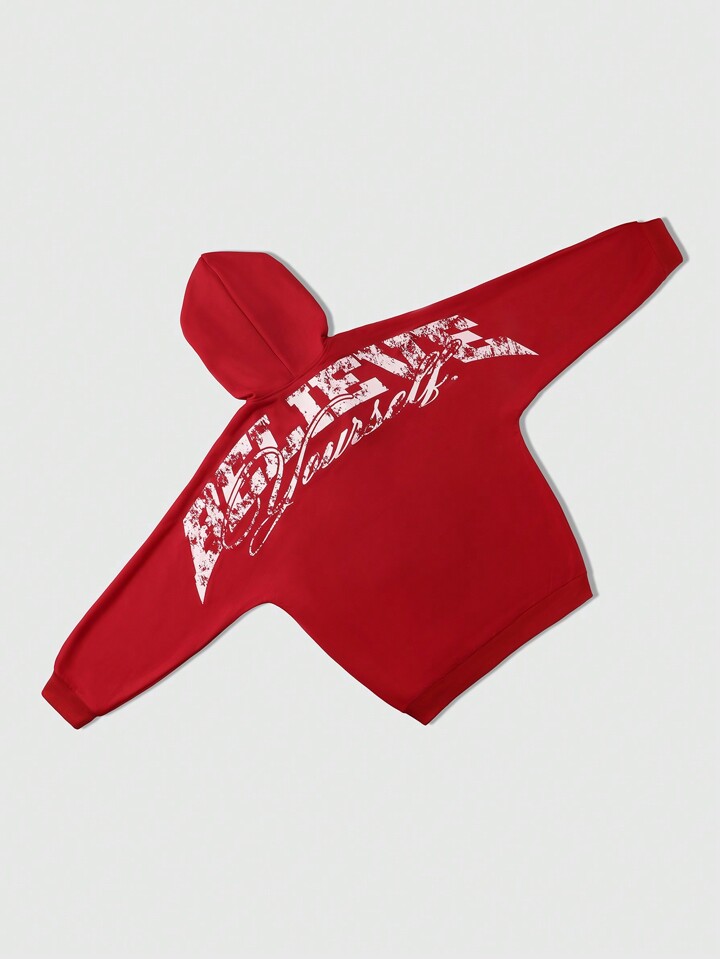 Street Life Men's Autumn/Winter Letter And Cross Print Zipper Front Drawstring Hooded Sweatshirt, Retro Streetwear