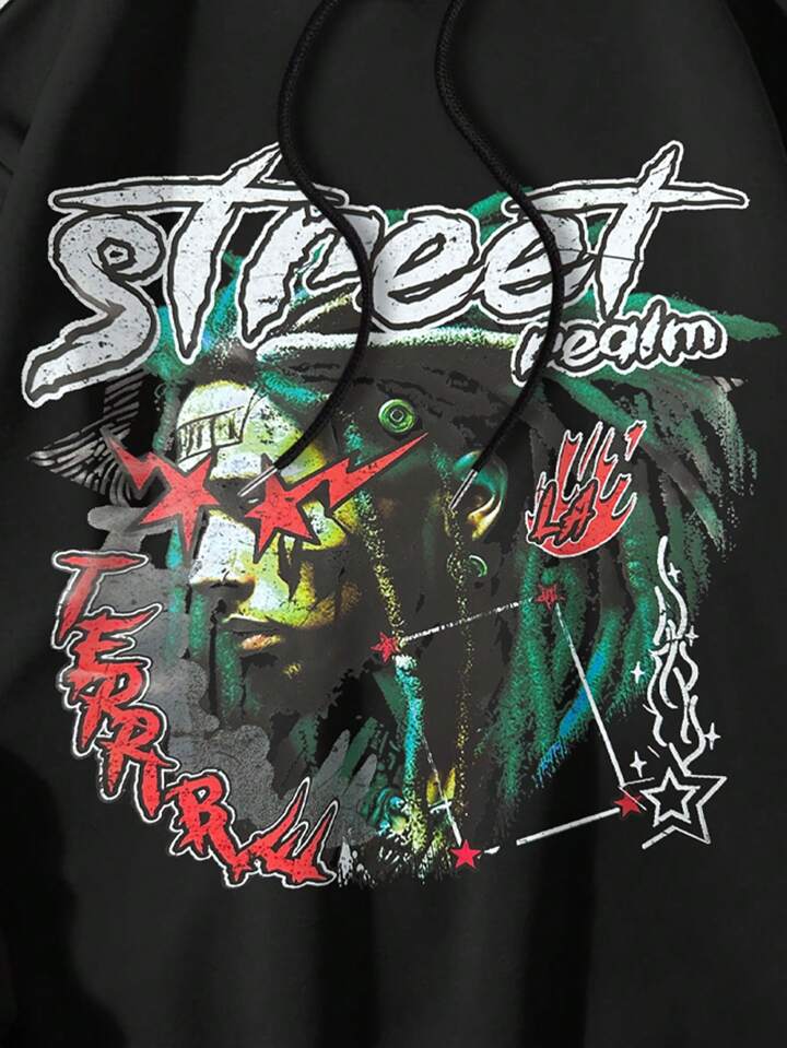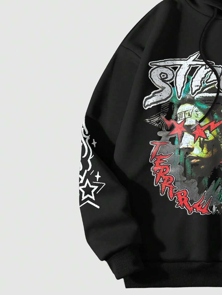 Street Life Men's Autumn/Winter Letter & Figure Print Drawstring Hoodie Casual Black Sweatshirt