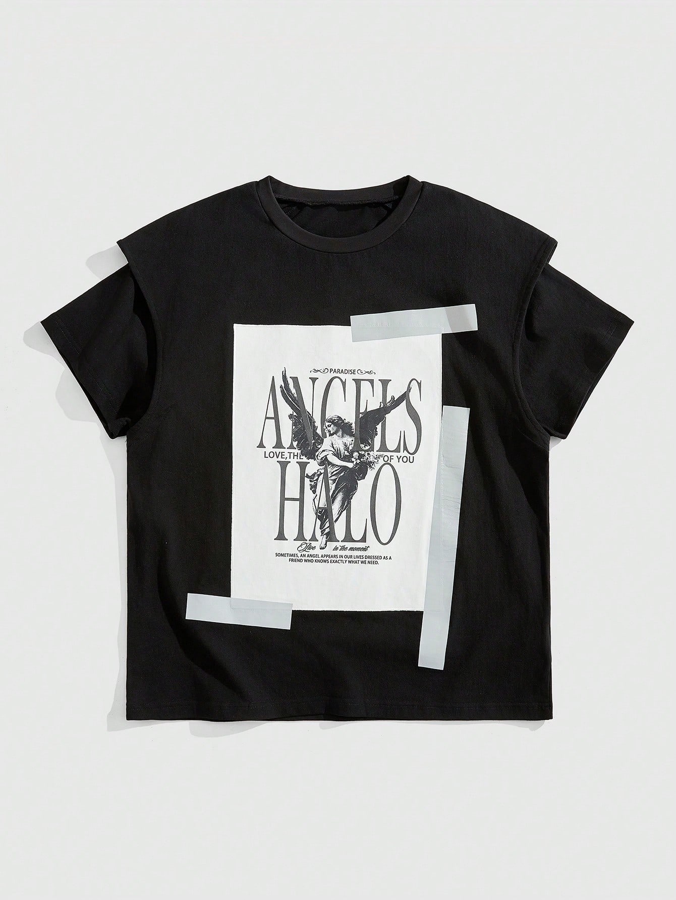 Street Life Men's Boxy Fit Vintage Letter & Angel Print Round Neck Short Sleeve T-Shirt, Summer