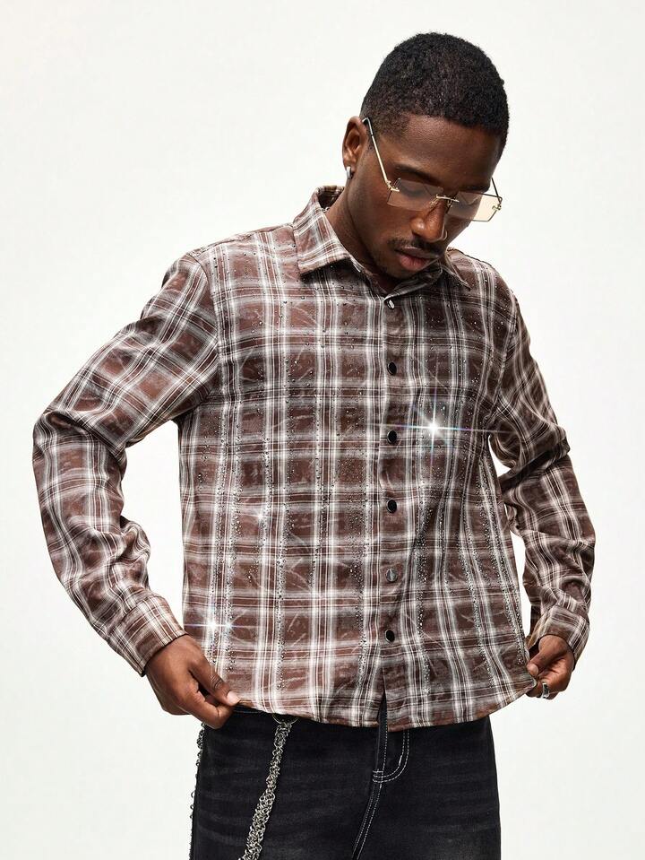 Street Life Men's Casual Fashionable Street Plaid Print Rhinestone Overcoat, Suitable For Daily Commute, Autumn