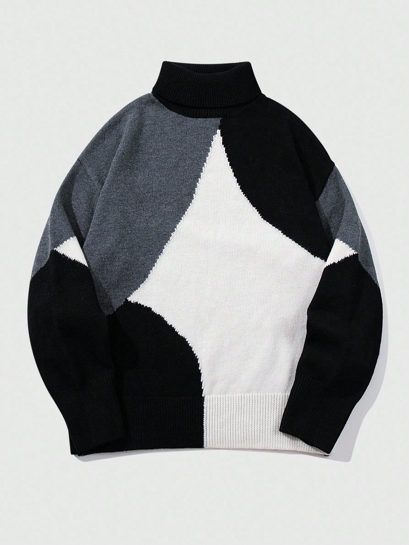 Street Life Men's Casual Loose Fit Turtleneck Contrast Color Sweater , Fall Winter