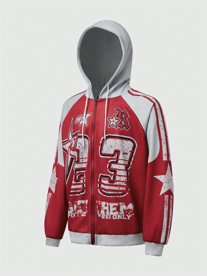 Street Life Men's Color Block Letter Print Hooded Zip Up Casual Long Sleeve Sweatshirt