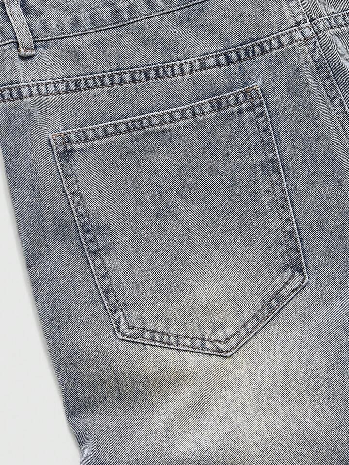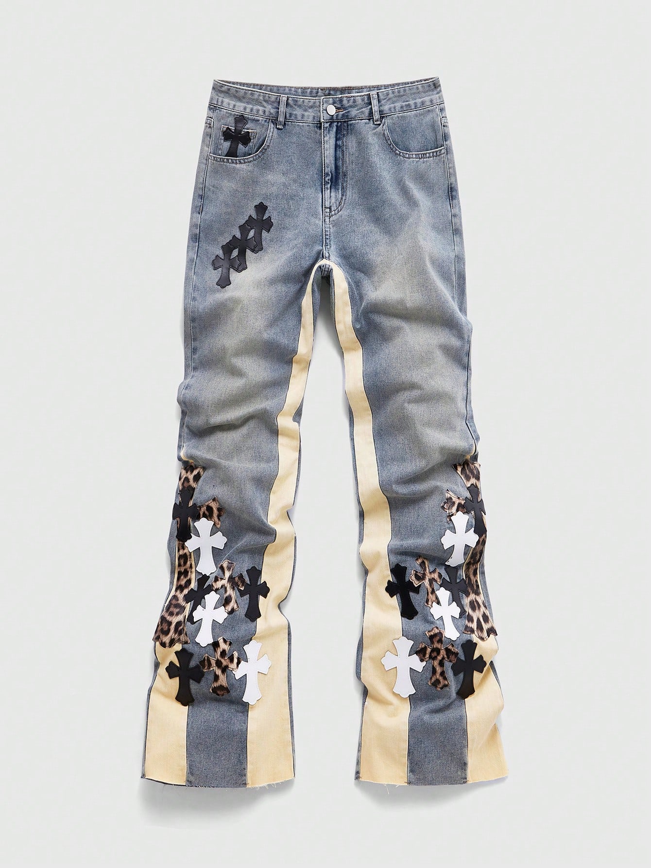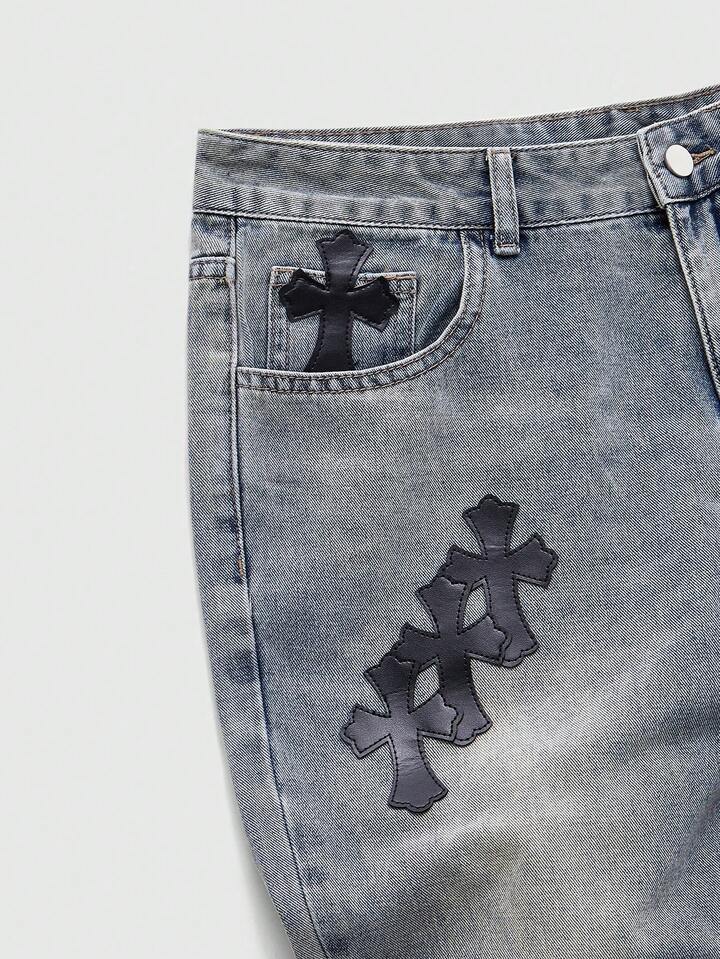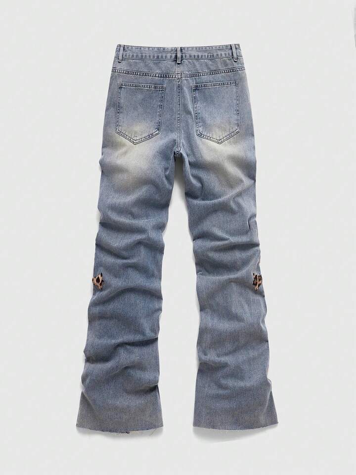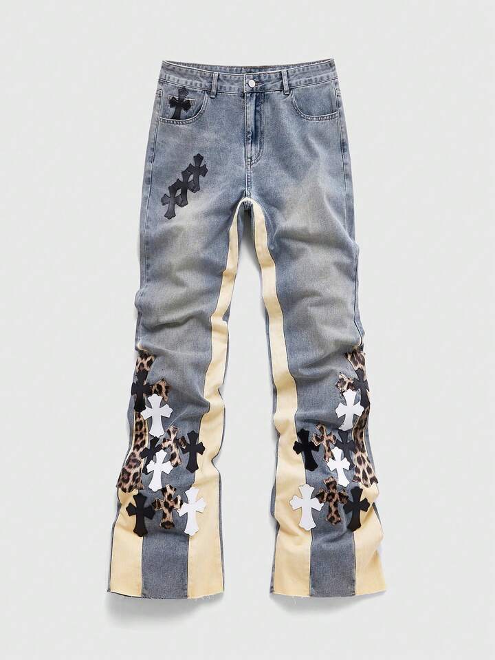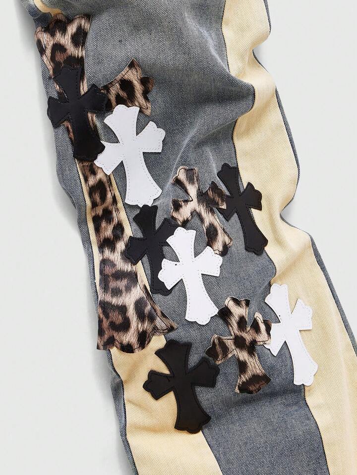 Street Life Men's Contrast Patchwork Leopard Cross Applique Jeans