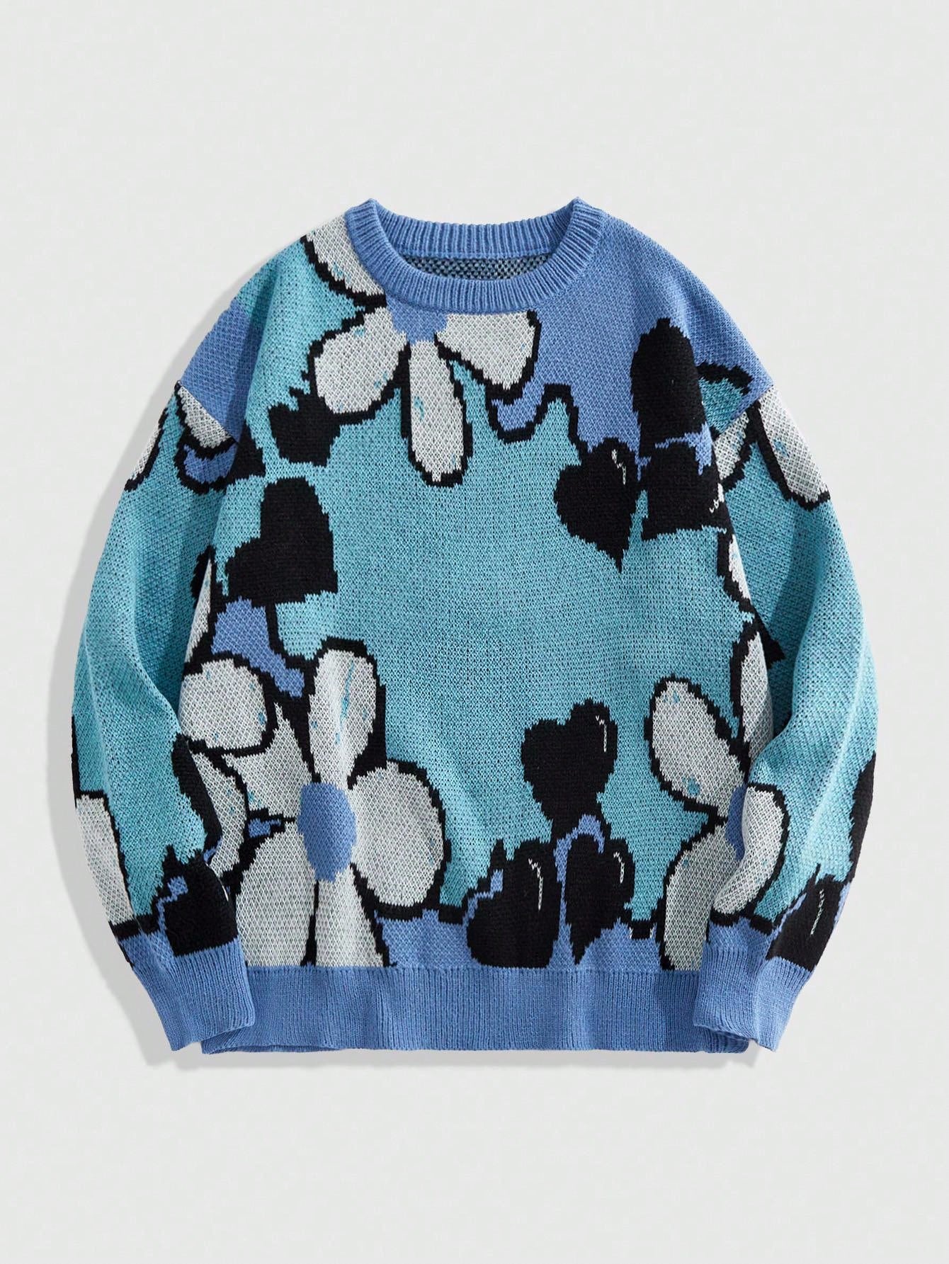 Street Life Men's Crew Neck Floral Contrast Color Knit Sweater , Fall Winter