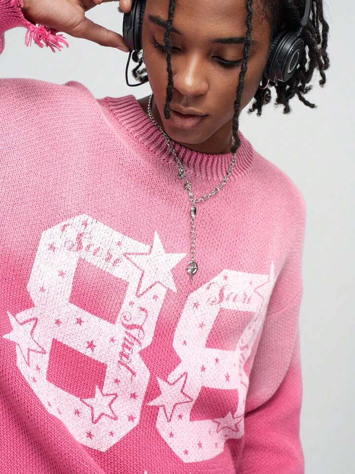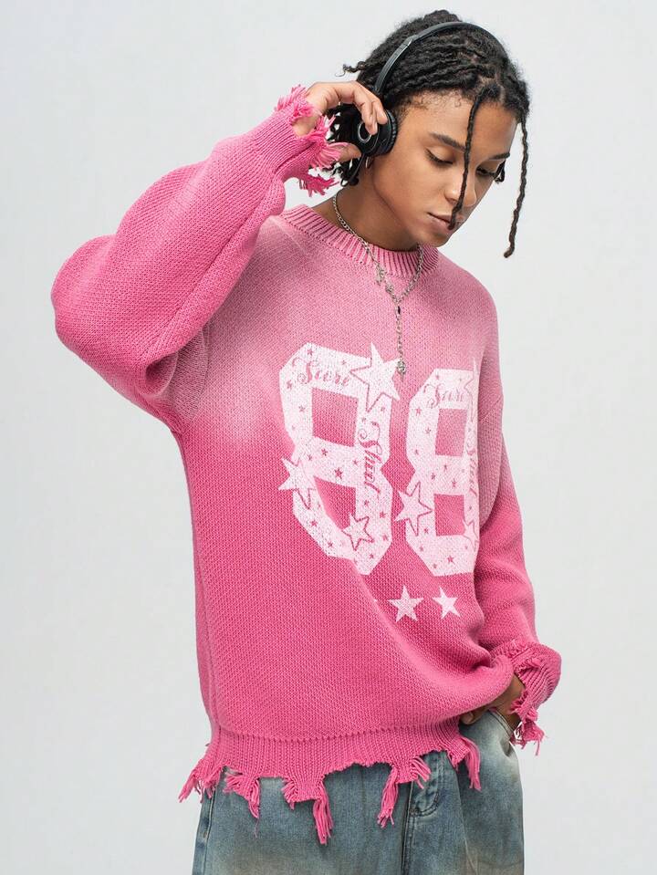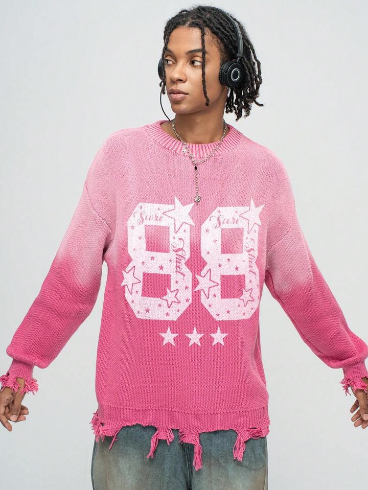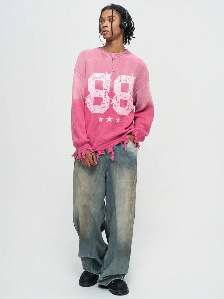 Street Life Men's Distressed Ombre Ripped Edge Star & Number Graphic Pullover Sweater