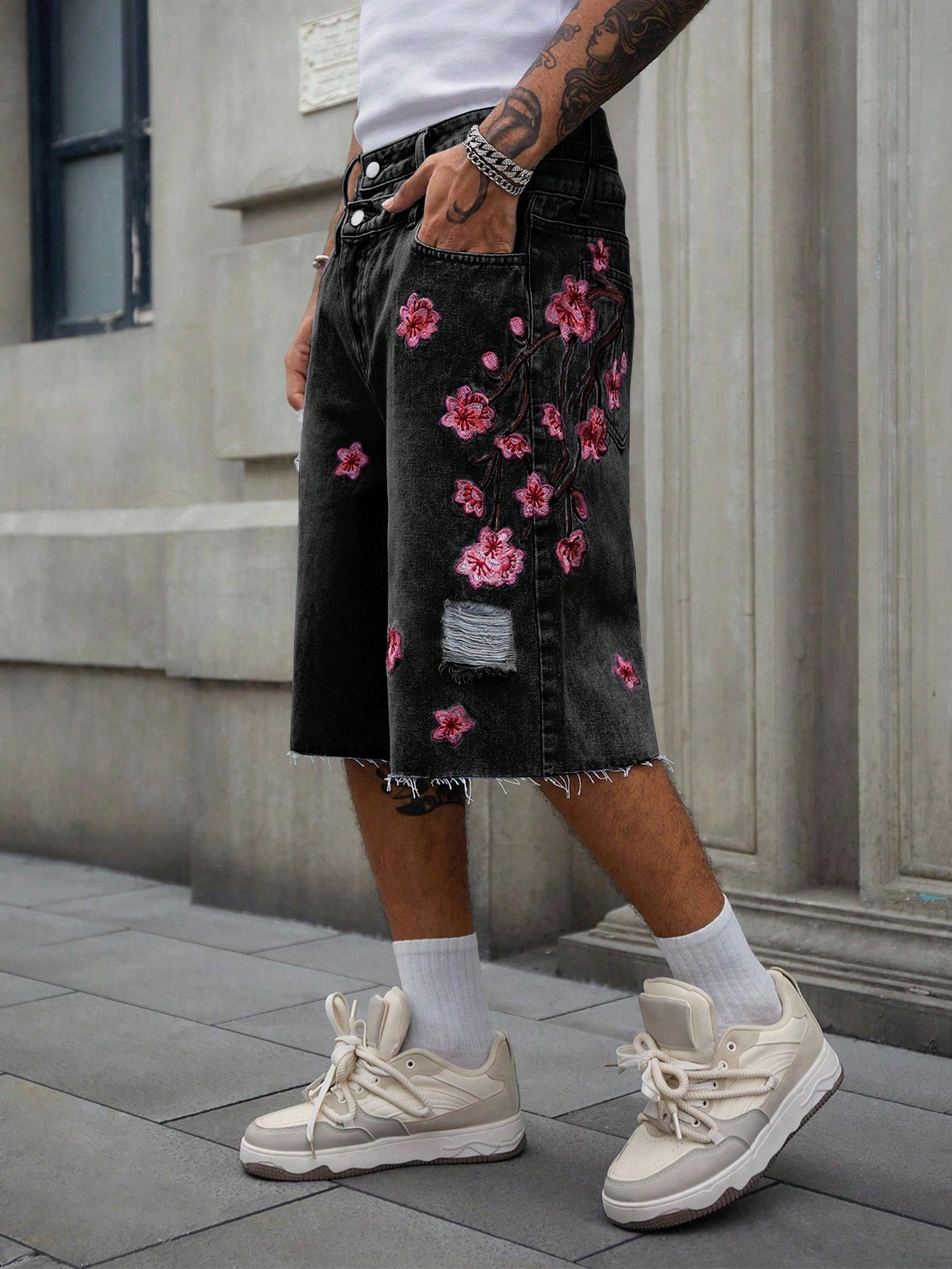 Street Life Men's Double-Layer Waistband Floral Embroidered Denim Shorts