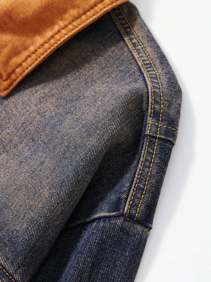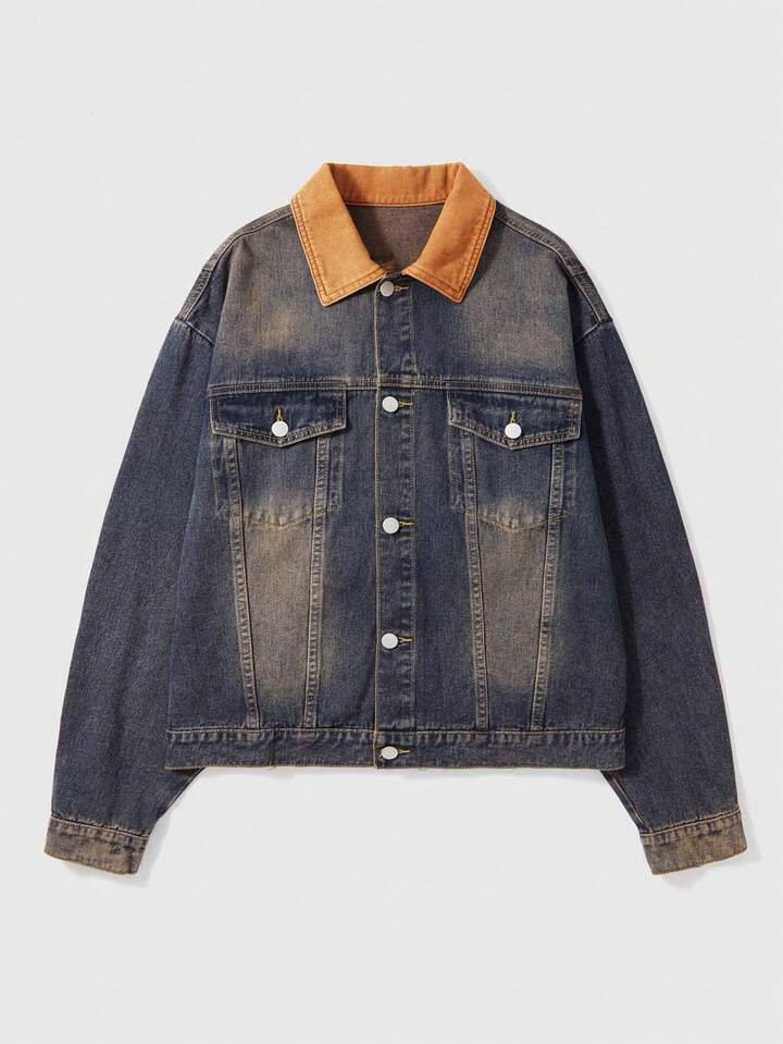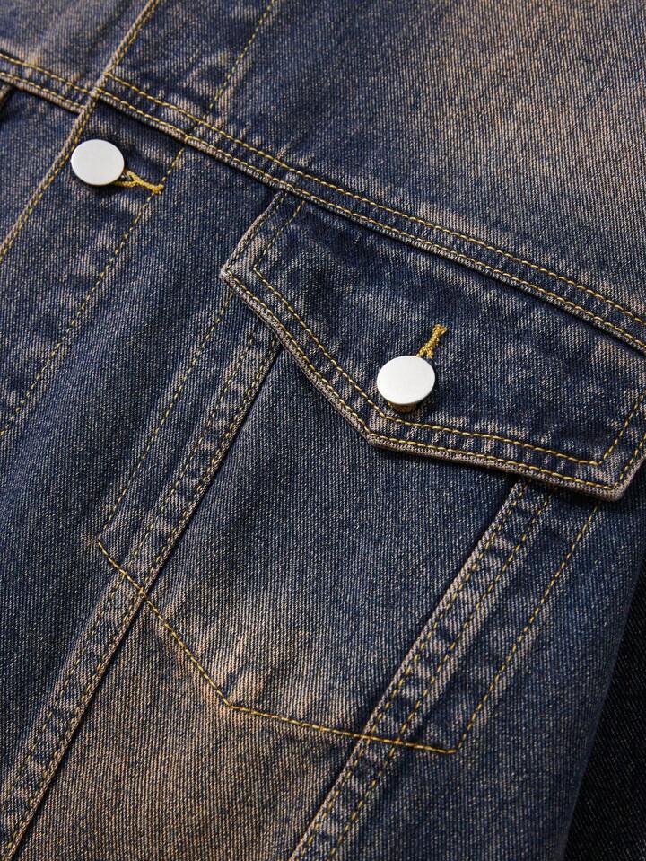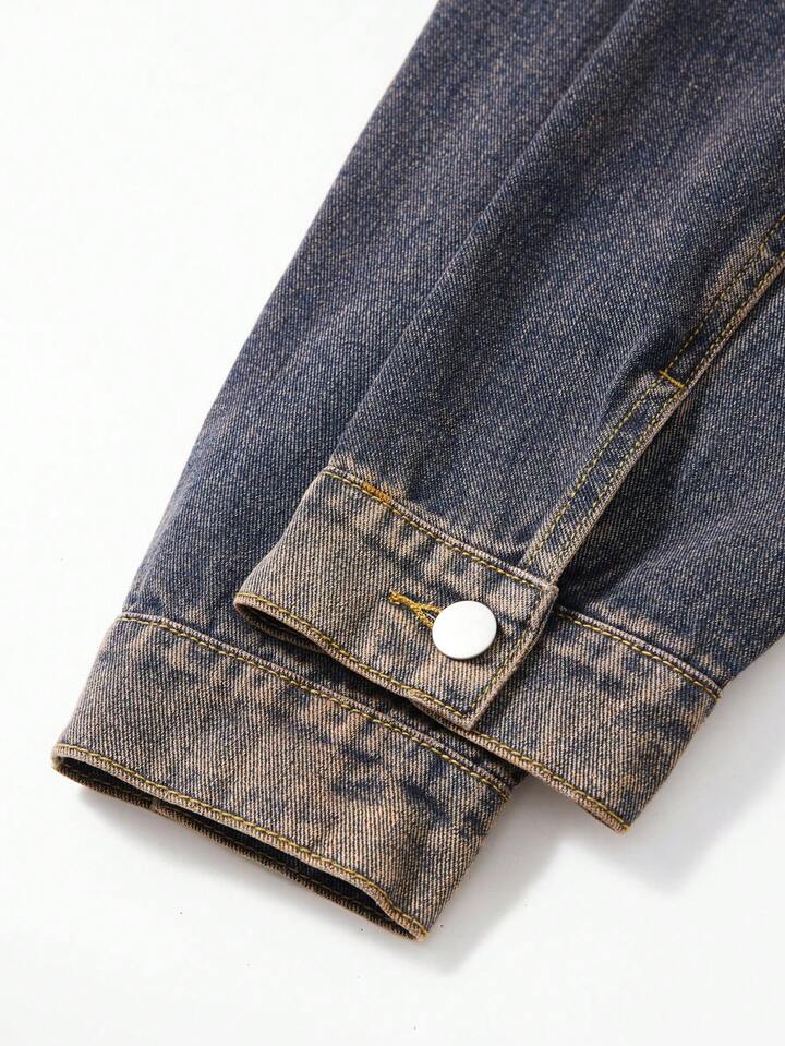 Street Life Men's Fashion Street Punk Contrast Color Collar Graphic Letter Print Distressed Washed Denim Jacket