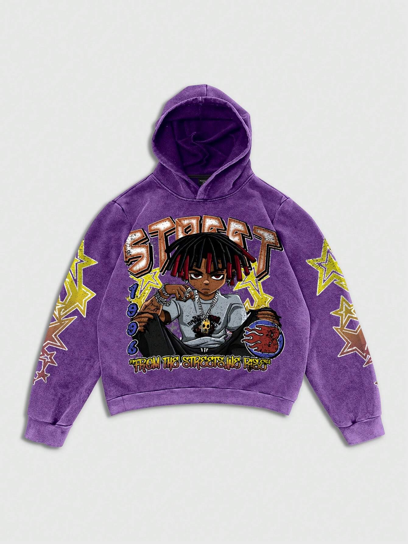 Street Life Men's Funny Portrait Print Washed Vintage Distressed Hoodie