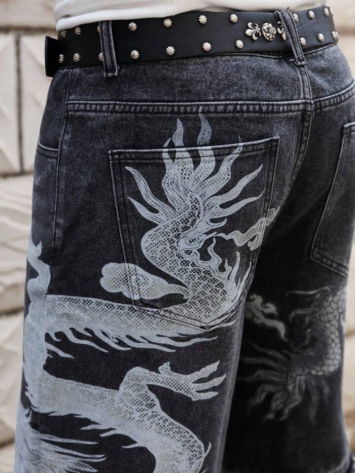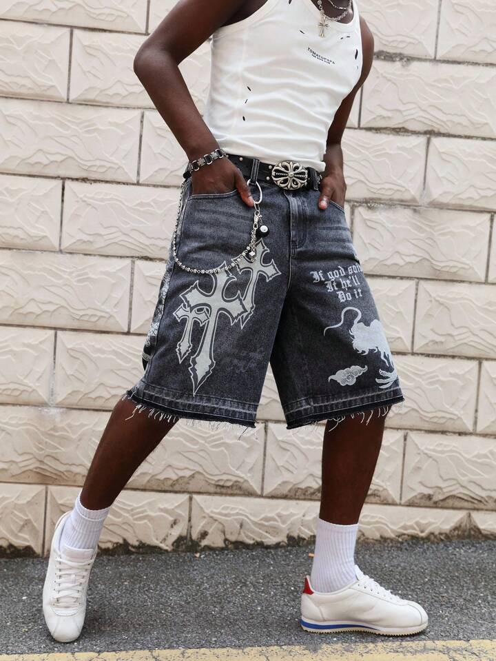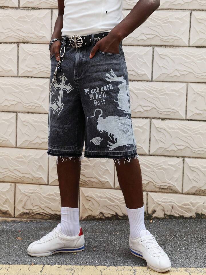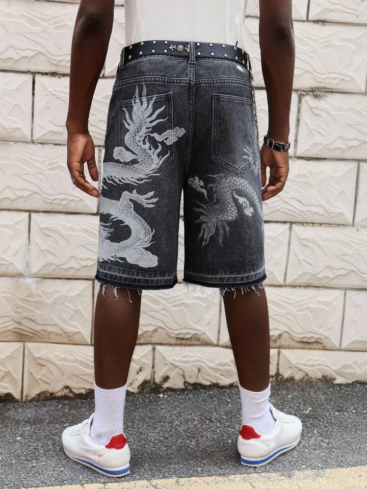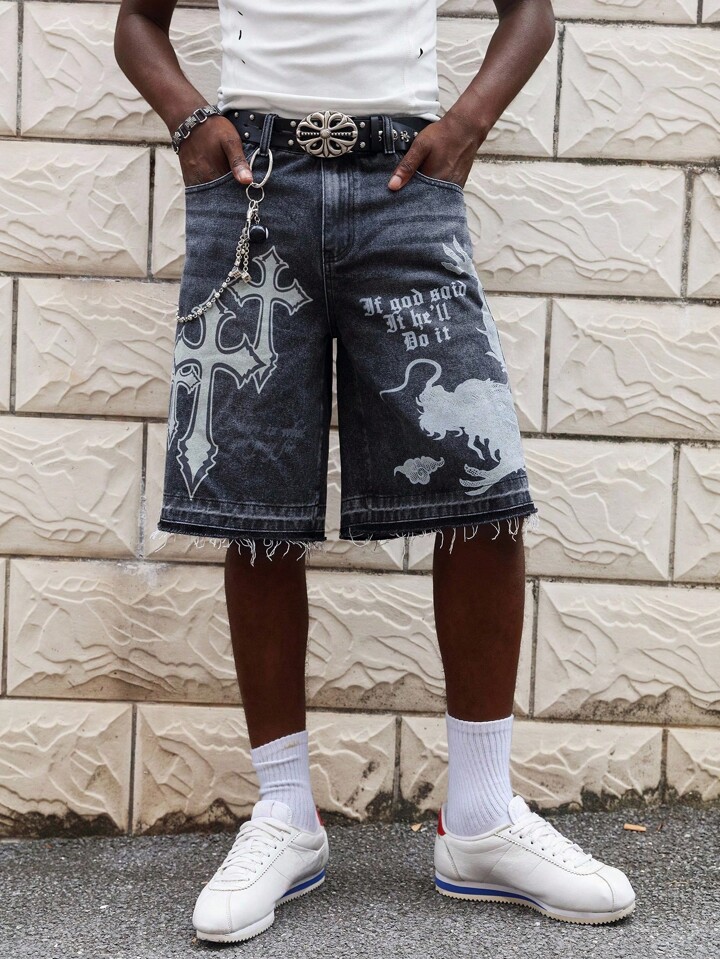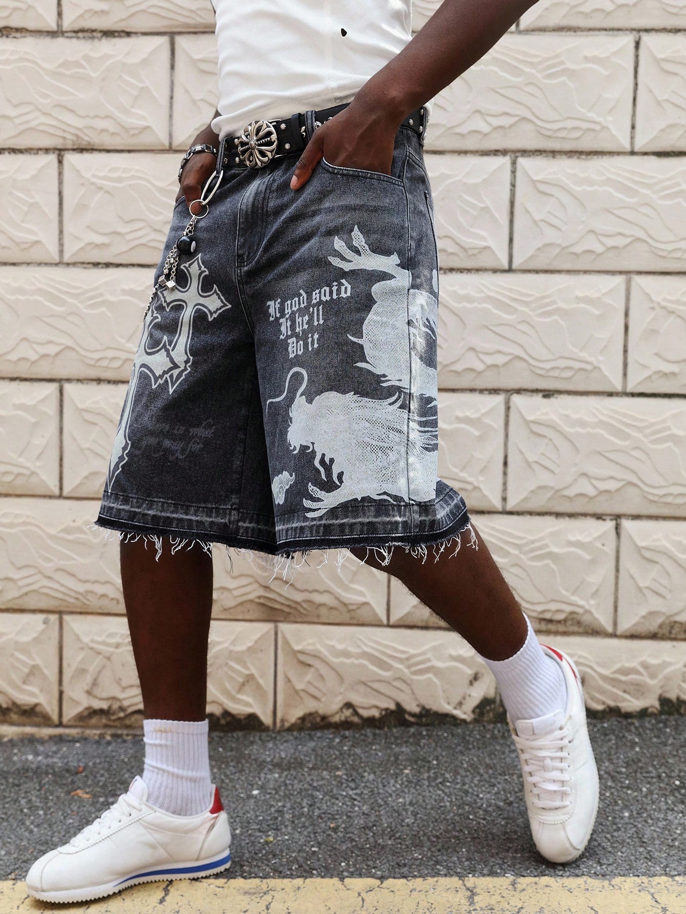 Street Life Men's Gothic Washed Cross Dragon Print Denim Shorts, Halloween