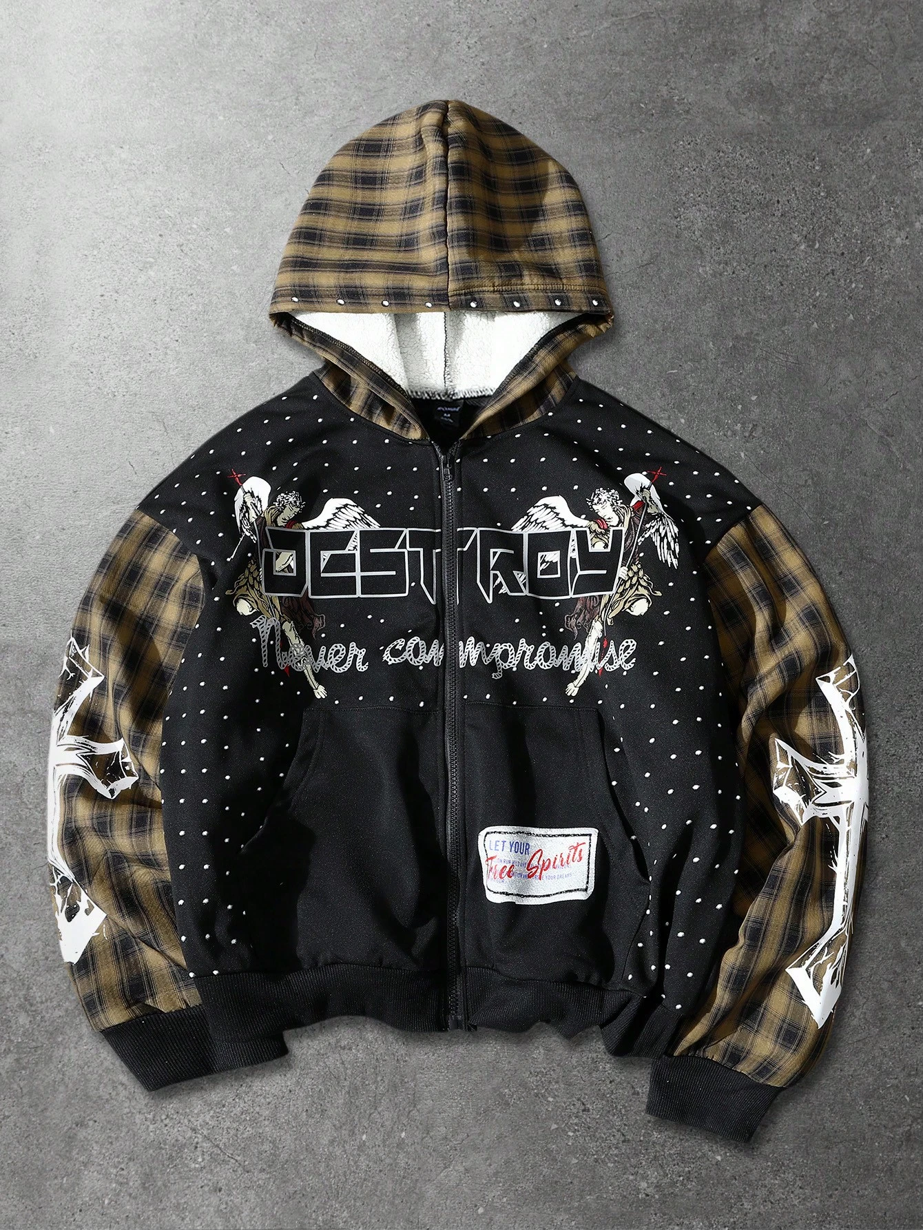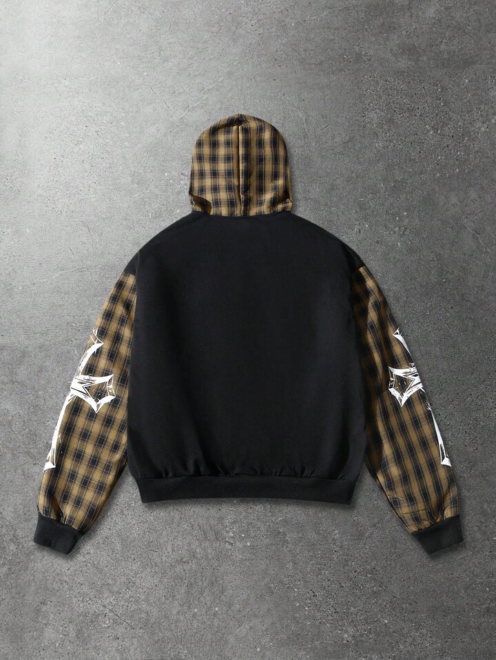 Street Life Men's Graphic Print Patchwork Plaid Zip Front Pocket Design Hoodie