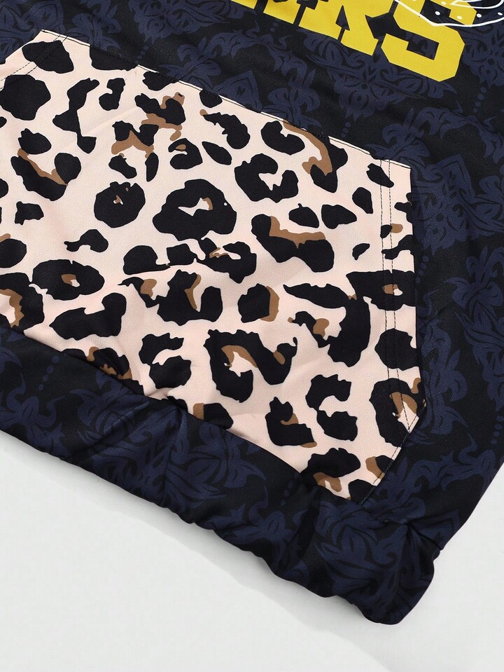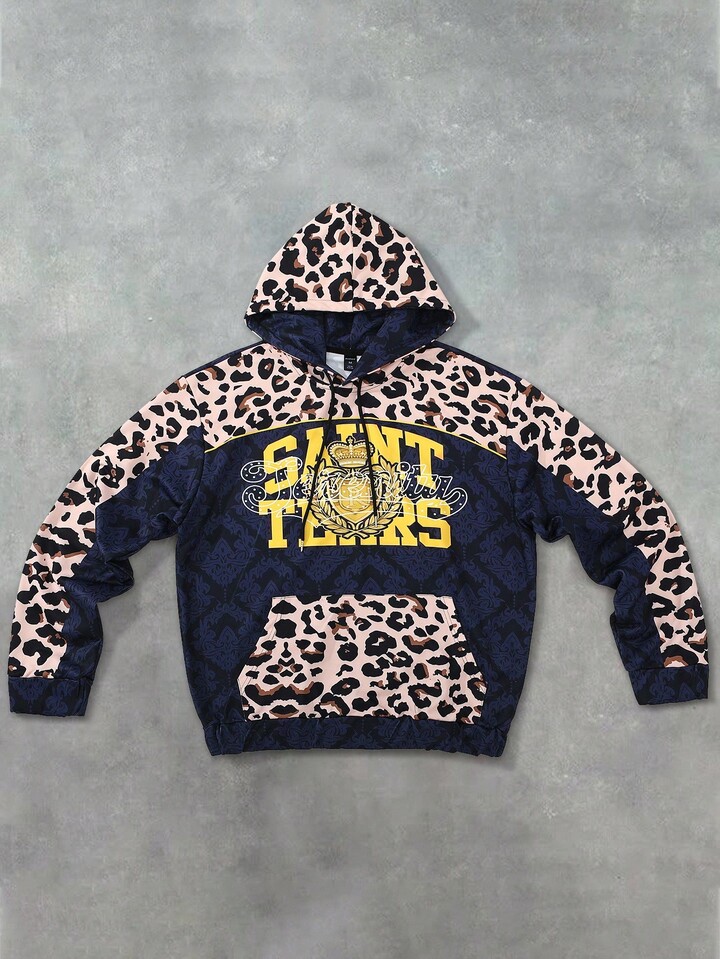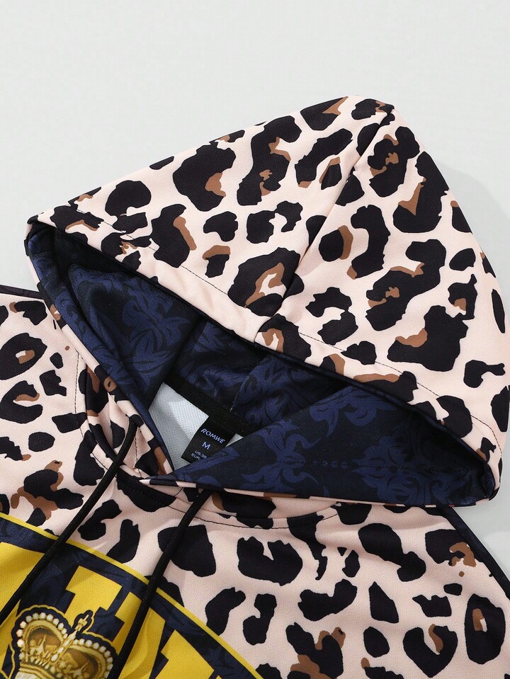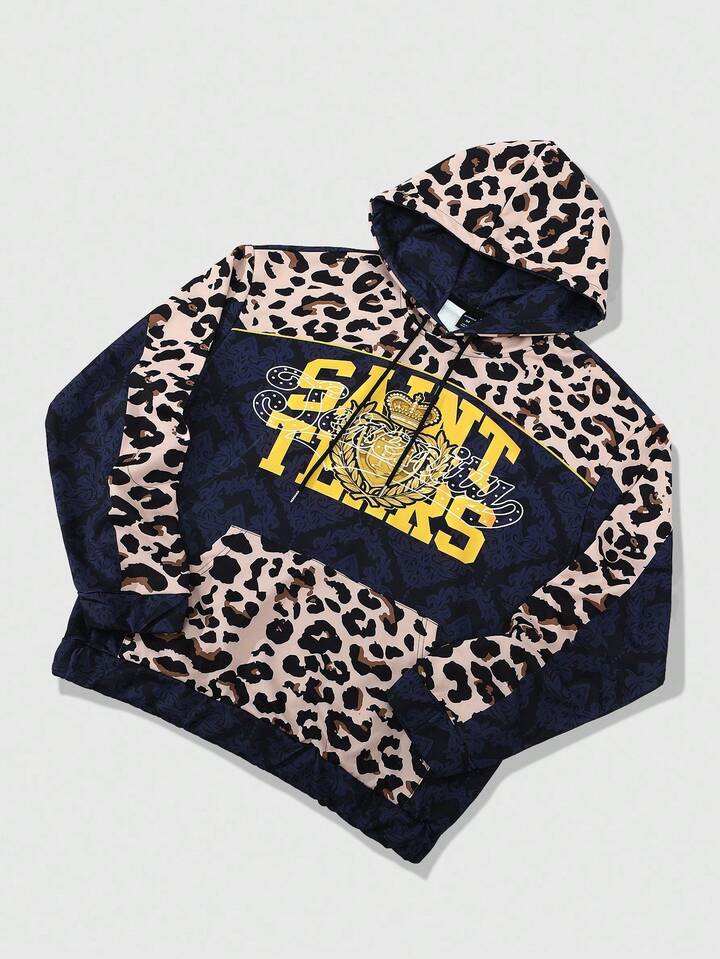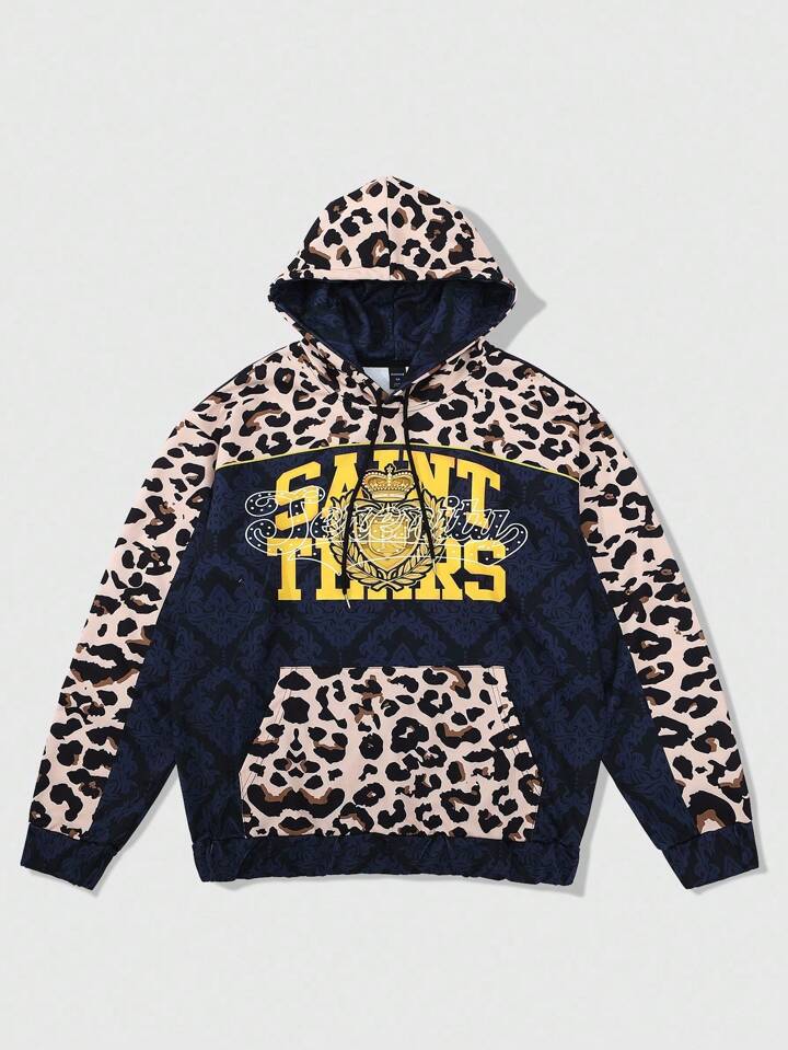 Street Life Men's Hooded Sweatshirt With Street American Leopard Print And English Graphic, Pullover Hoodie