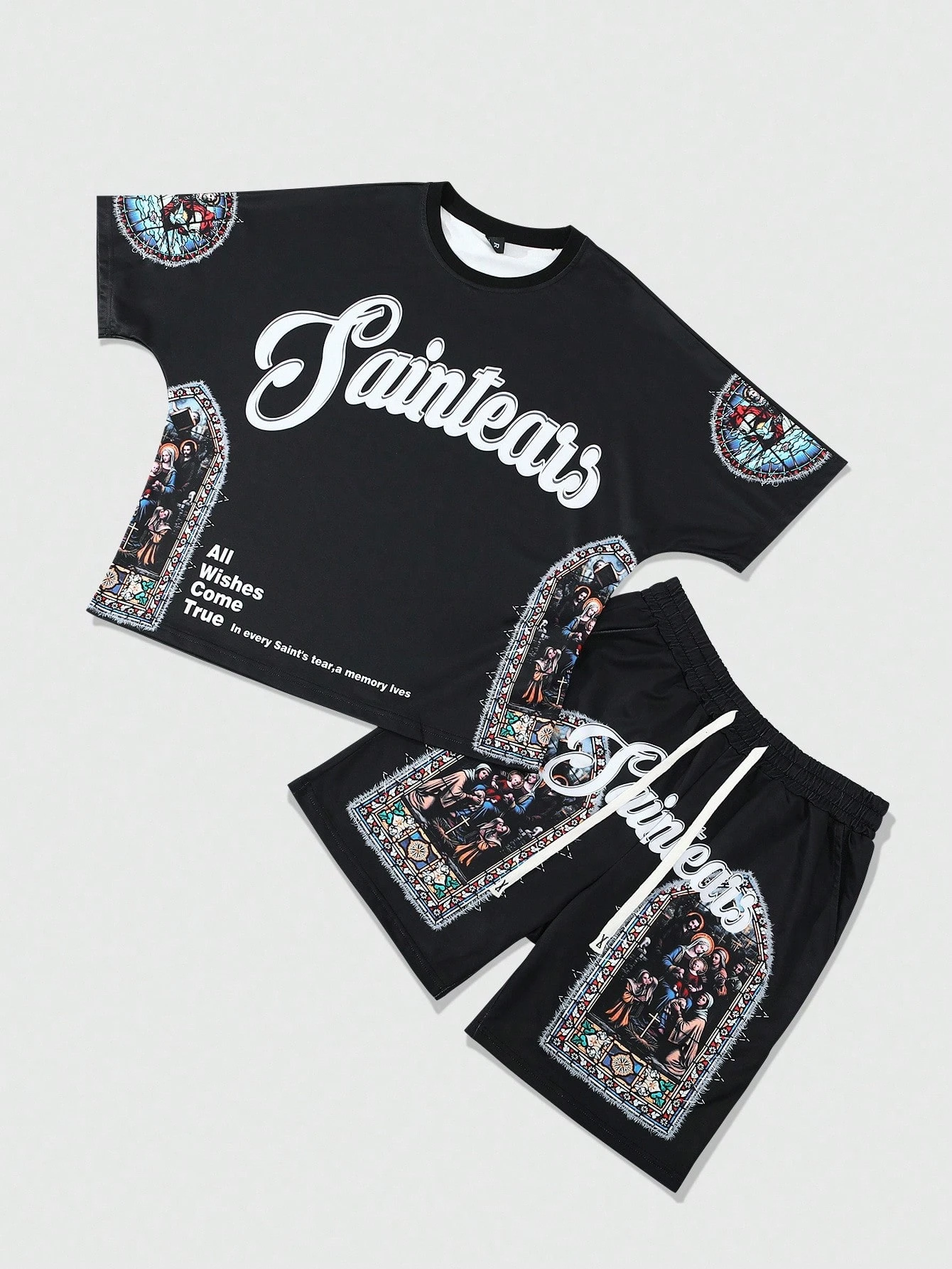 Street Life Men's Jesus English Graphic Print Batwing Short Sleeve T-Shirt & Shorts Set, Halloween