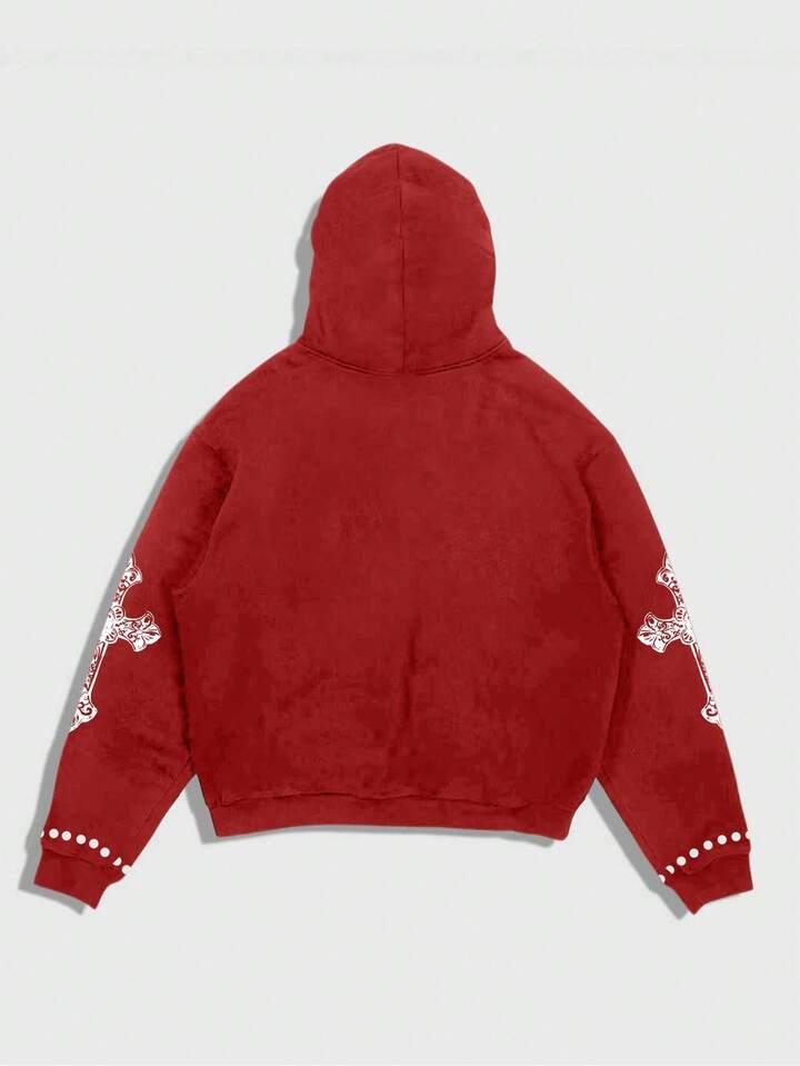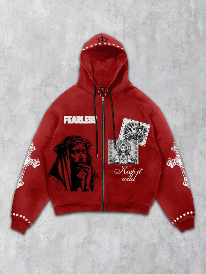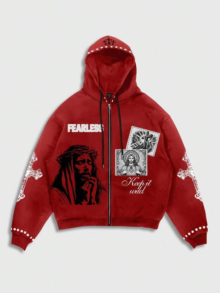 Street Life Men's Jesus Rhinestone Decor Religious Character Hooded Zip-Up Long Sleeve Sweatshirt, Fall