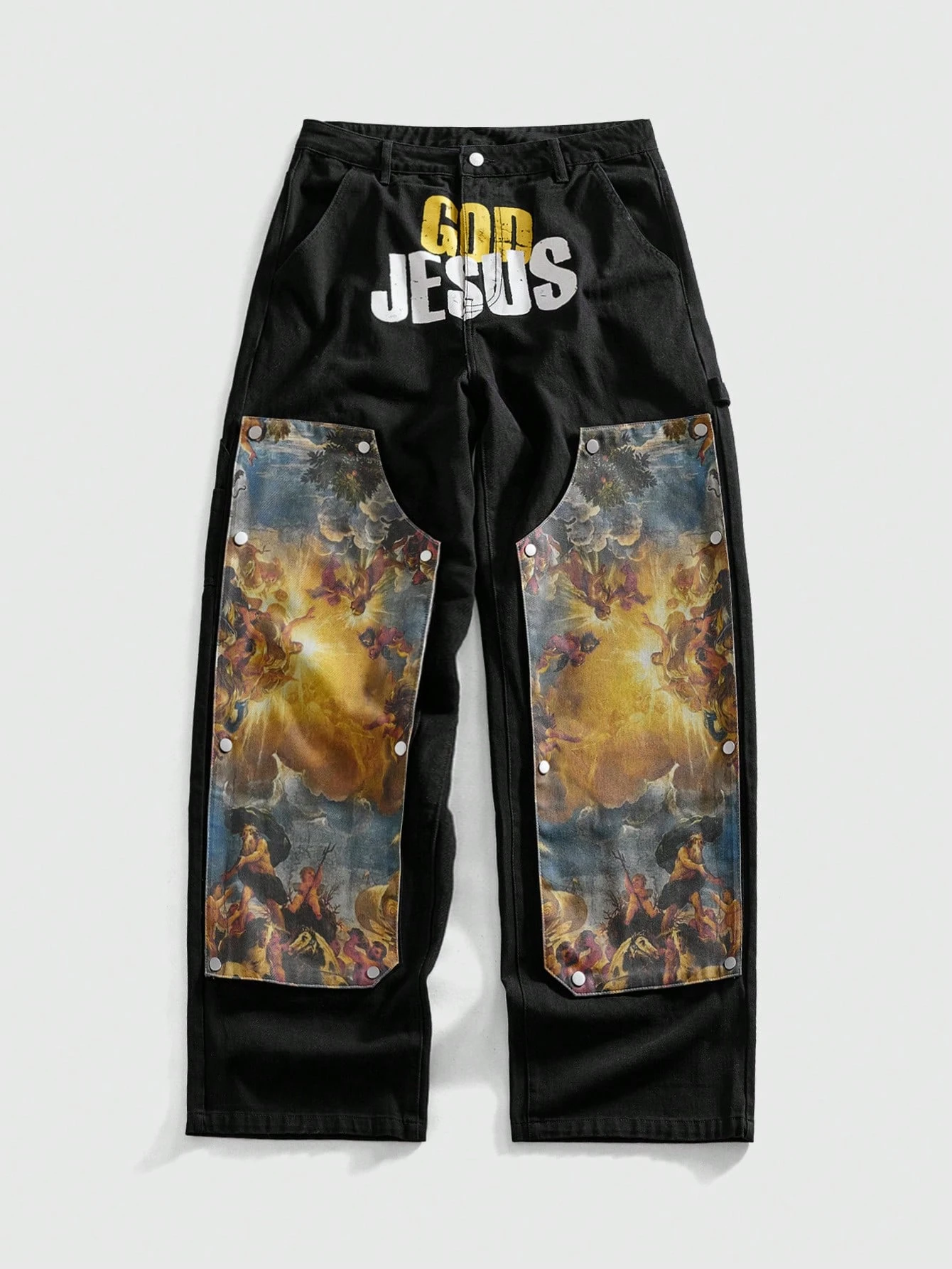 Street Life Men's Letter & Figure Graphic Pocket Wide Leg Loose Casual Jeans